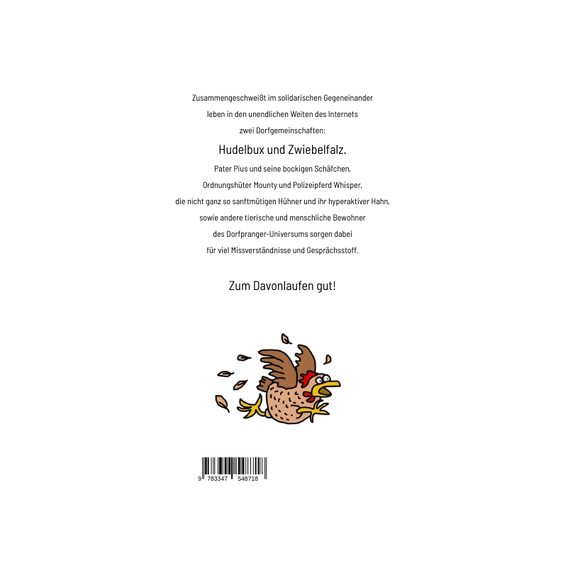 Zusammengeschweißt im solidarischen Gegeneinander leben in den unendlichen Weiten des Internets zwei Dorfgemeinschaften - Hudelbux und Zwiebelfalz. Das Zusammenleben der Nachfahren verwegener (aber dekadenter) Strandräuber und der Abkömmlinge sturer (aber weltoffener) Bergbewohner ist geprägt von Kuriositäten und Animositäten. Pater Pius und seine bockigen Schäfchen, der unbestechliche Ordnungshüter Mounty und sein nahezu fast ganz unbestechliches Polizeipferd Whisper, der technisch ebenso innovative wie unbegabte Bürgermeister, die nicht ganz so sanftmütigen Hühner und ihr hyperaktiver Hahn, sowie andere tierische und menschliche Bewohner des Dorfpranger-Universums sorgen dabei für so viel Missverständnisse und Gesprächsstoff, dass wir ein Buch herausgebracht haben. Schon wieder!
