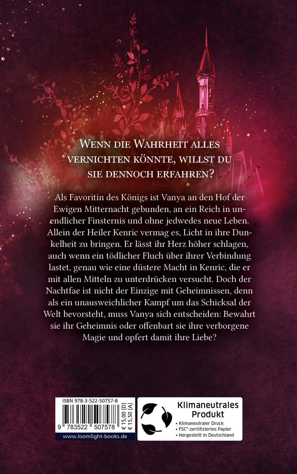 Als Favoritin des Königs ist Vanya an den Hof der Ewigen Mitternacht gebunden, an ein Reich in unendlicher Finsternis und ohne jedwedes neue Leben. Allein der Heiler Kenric vermag es, Licht in ihre Dunkelheit zu bringen. Er lässt ihr Herz höher schlagen, auch wenn ein tödlicher Fluch über ihrer Verbindung lastet, genau wie eine düstere Macht in Kenric, die er mit allen Mitteln zu unterdrücken versucht. Doch der Nachtfae ist nicht der Einzige mit Geheimnissen, denn als ein unausweichlicher Kampf um das Schicksal der Welt bevorsteht, muss Vanya sich entscheiden: Bewahrt sie ihr Geheimnis oder offenbart sie ihre verborgene Magie und opfert damit ihre Liebe?