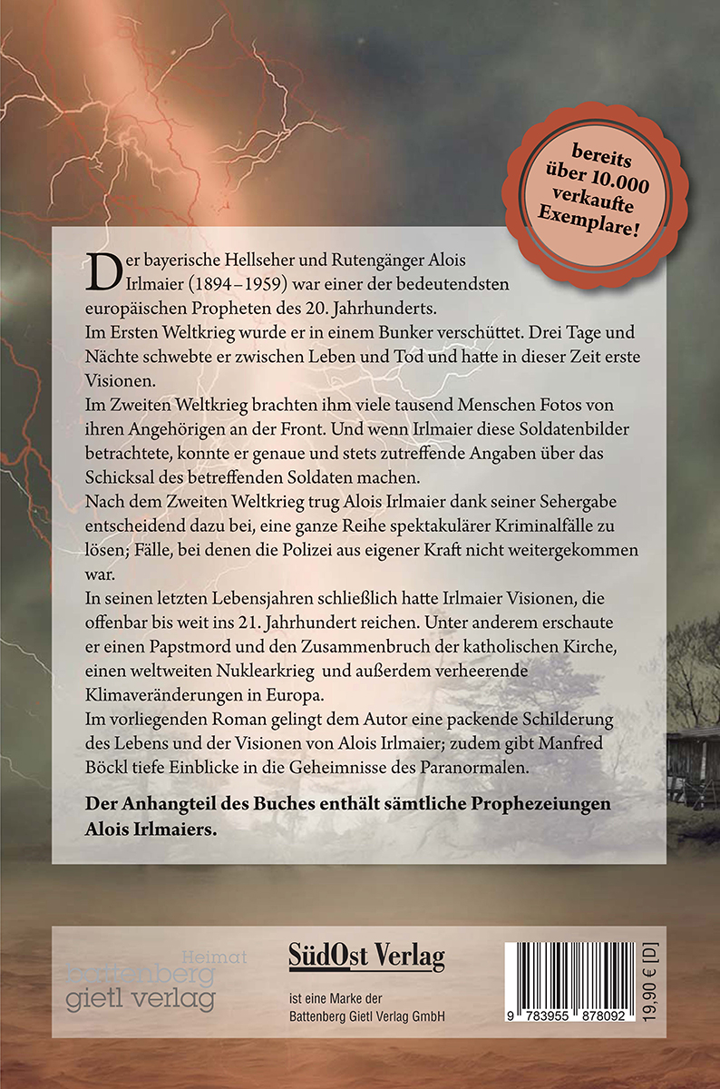 Der bayerische Hellseher und Rutengänger Alois Irlmaier (1894 bis 1959) war einer der bedeutendsten europäischen Propheten des 20. Jahrhunderts. Im Ersten Weltkrieg wurde er in einem Bunker verschüttet. Drei Tage und Nächte schwebte er zwischen Leben und Tod und hatte in dieser Zeit erste Visionen.Im Zweiten Weltkrieg brachten ihm viele tausend Menschen Fotos von ihren Angehörigen an der Front. Und wenn Irlmaier diese Soldatenbilder betrachtete, konnte er genaue und stets zutreffende Angaben über das Schicksal des betreffenden Soldaten machen. Nach dem Zweiten Weltkrieg trug Alois Irlmaier dank seiner Sehergabe entscheidend dazu bei, eine ganze Reihe spektakulärer Kriminalfälle zu lösen; Fälle, bei denen die Polizei aus eigener Kraft nicht weitergekommen war.In seinen letzten Lebensjahren schließlich hatte Irlmaier Visionen, die offenbar bis weit ins 21. Jahrhundert reichen. Unter anderem erschaute er einen Papstmord und den Zusammenbruch der katholischen Kirche, einen weltweiten Nuklearkrieg und außerdem verheerende Klimaveränderungen in Europa.Im vorliegenden Roman gelingt dem Autor eine packende Schilderung des Lebens und der Visionen von Alois Irlmaier; zudem gibt Manfred Böckl tiefe Einblicke in die Geheimnisse des Paranormalen.Der Anhangteil des Buches enthält sämtliche Prophezeiungen Alois Irlmaiers.