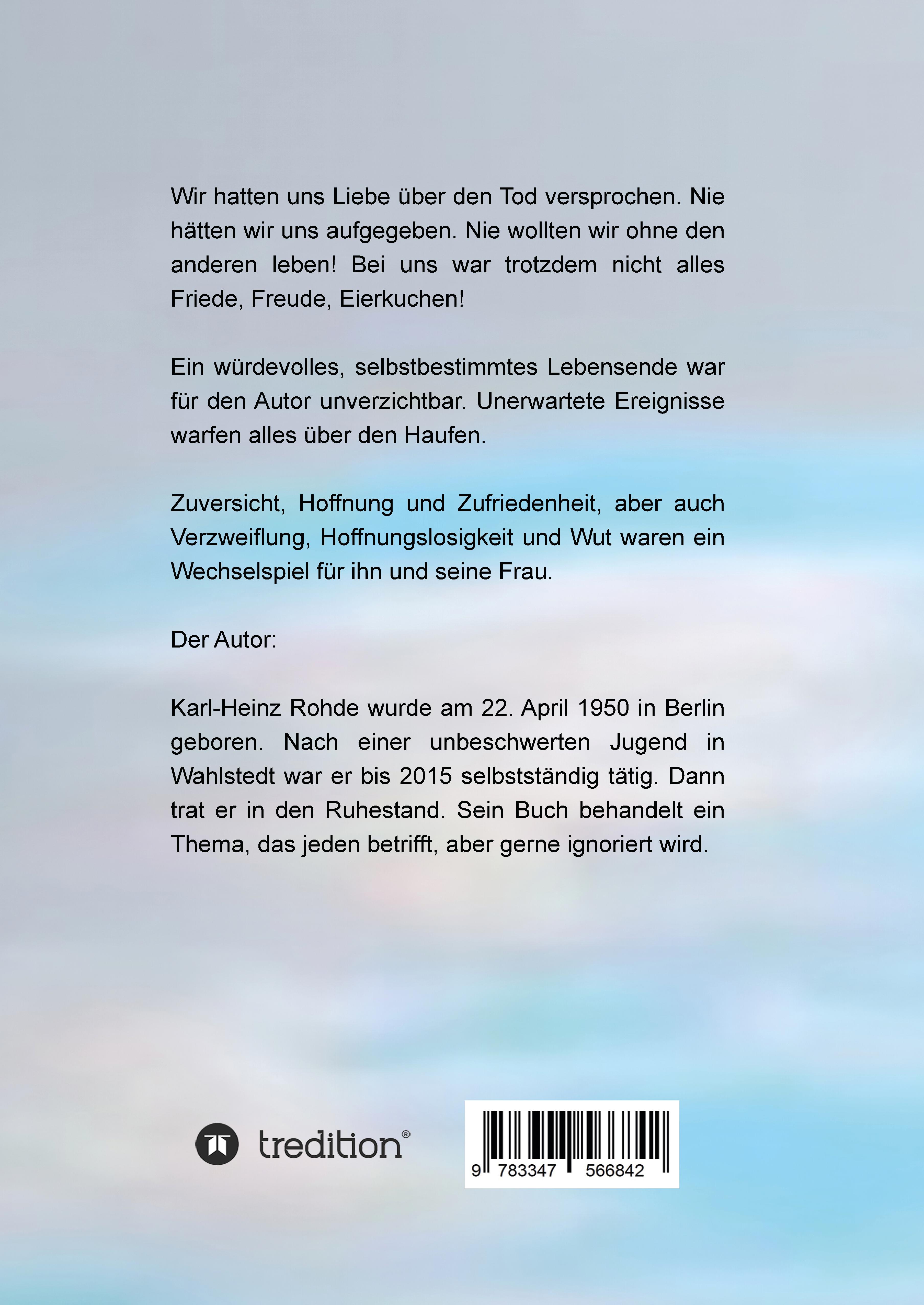 Um die Lebensgeschichte und das 'Selbstbestimmte Lebensende' zweier Menschen.Sie waren gute Freunde. Daraus wuchs eine große Liebe über den Tod hinaus.Jetzt kämpfen sie um ein würdevolles selbst bestimmtes Lebensende.Das Buch beschreibt die Ereignisse und die Gemütslagen, die Hoffnung aber auch die Hoffnungslosigkeit sowie die Verzweiflung des Autors und seiner Ehefrau.Das Buch gibt auch einen Einblick in private Lebensbereiche.