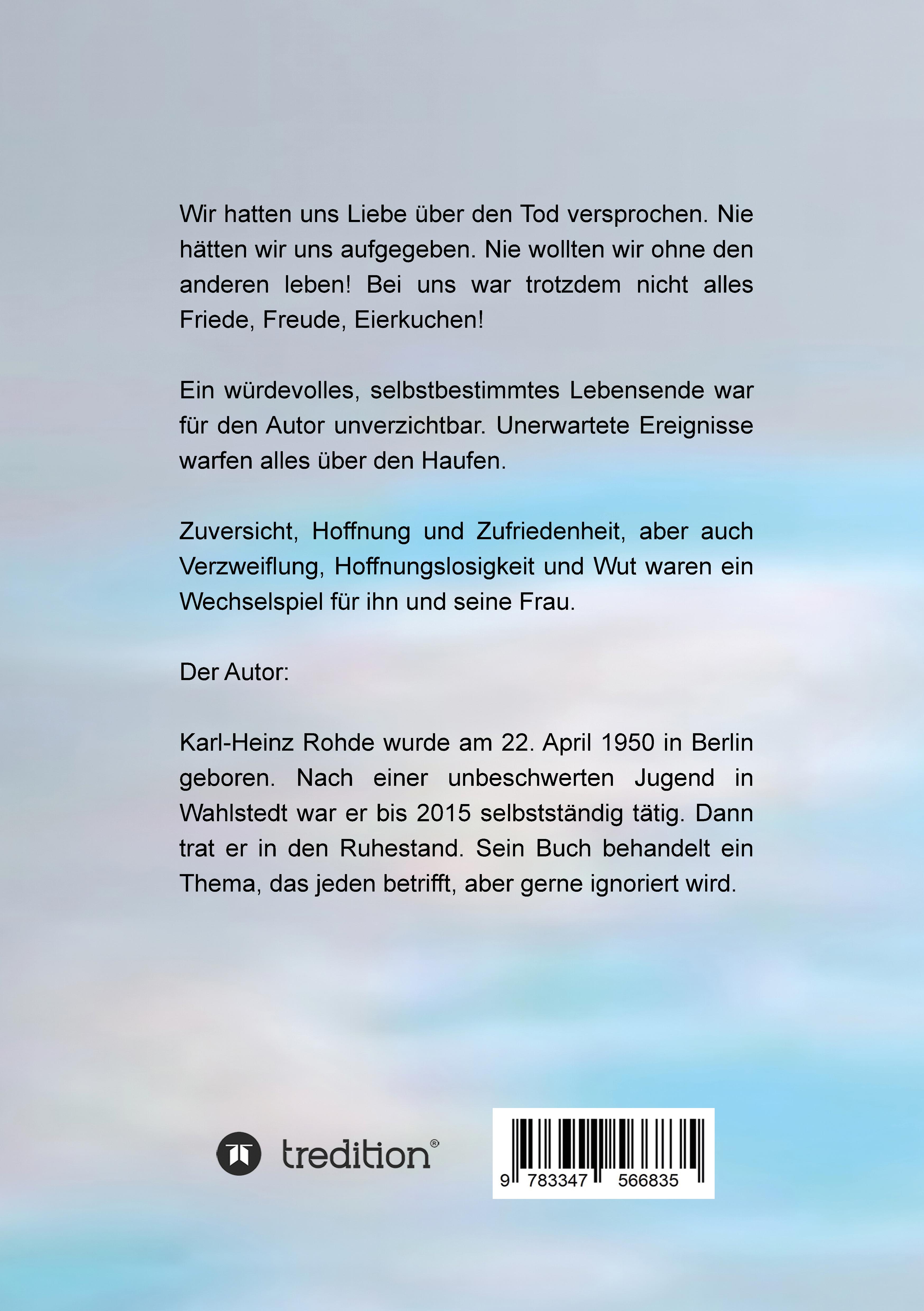 Um die Lebensgeschichte und das 'Selbstbestimmte Lebensende' zweier Menschen.Sie waren gute Freunde. Daraus wuchs eine große Liebe über den Tod hinaus.Jetzt kämpfen sie um ein würdevolles selbst bestimmtes Lebensende.Das Buch beschreibt die Ereignisse und die Gemütslagen, die Hoffnung aber auch die Hoffnungslosigkeit sowie die Verzweiflung des Autors und seiner Ehefrau.Das Buch gibt auch einen Einblick in private Lebensbereiche.