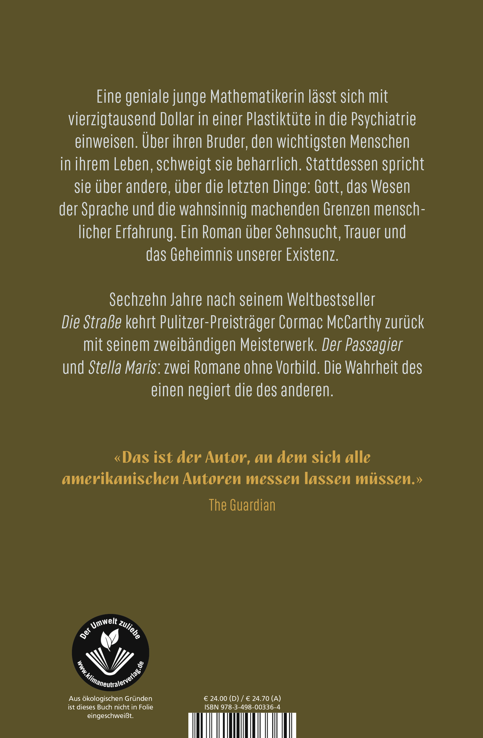 Sechzehn Jahre nach seinem Weltbestseller Die Straße kehrt Pulitzer-Preisträger Cormac McCarthy zurück mit seinem zweibändigen Meisterwerk. Der Passagier und Stella Maris: Zwei Romane ohne Vorbild. Die Wahrheit des einen negiert die des anderen.