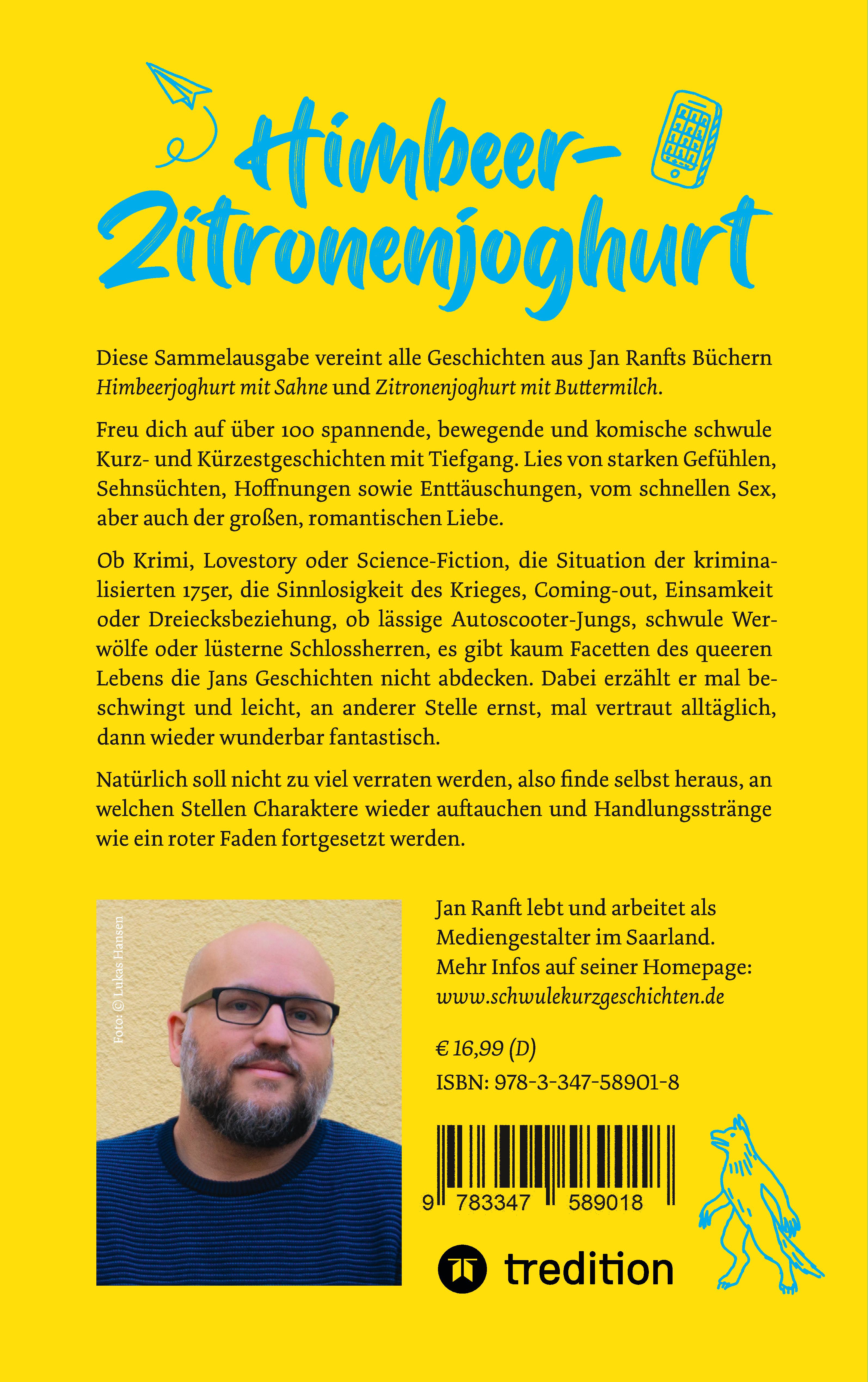 Über 100 spannende, bewegende und komische schwule Kurz- und Kürzestgeschichten mit Tiefgang. Lies von starken Gefühlen, Sehnsüchten, Hoffnungen sowie Enttäuschungen, vom schnellen Sex, aber auch der großen, romantischen Liebe.Ob Krimi, Lovestory oder Science-Fiction, die Situation der kriminalisierten 175er, die Sinnlosigkeit des Krieges, Coming-out, Einsamkeit oder Dreiecksbeziehung, ob lässige Autoscooter-Jungs, schwule Werwölfe oder lüsterne Schlossherren, es gibt kaum Facetten des queeren Lebens die Jans Geschichten nicht abdecken. Dabei erzählt er mal beschwingt und leicht, an anderer Stelle ernst, mal vertraut alltäglich, dann wieder wunderbar fantastisch.Natürlich soll nicht zu viel verraten werden, also finde selbst heraus, an welchen Stellen Charaktere wieder auftauchen und Handlungsstränge wie ein roter Faden fortgesetzt werden.