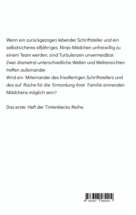 Wenn ein zurückgezogen lebender Schriftsteller und ein selbstsicheres elfjähriges Ninja-Mädchen unfreiwillig zu einem Team werden, sind Turbulenzen unvermeidbar. Zwei diametral unterschiedliche Welten und Weltansichten treffen aufeinander. Wird ein Miteinander des friedfertigen Schriftstellers und des auf Rache für die Ermordung ihrer Familie sinnenden Mädchens möglich sein?Das erste Heft der Tintenklecks-Reihe.