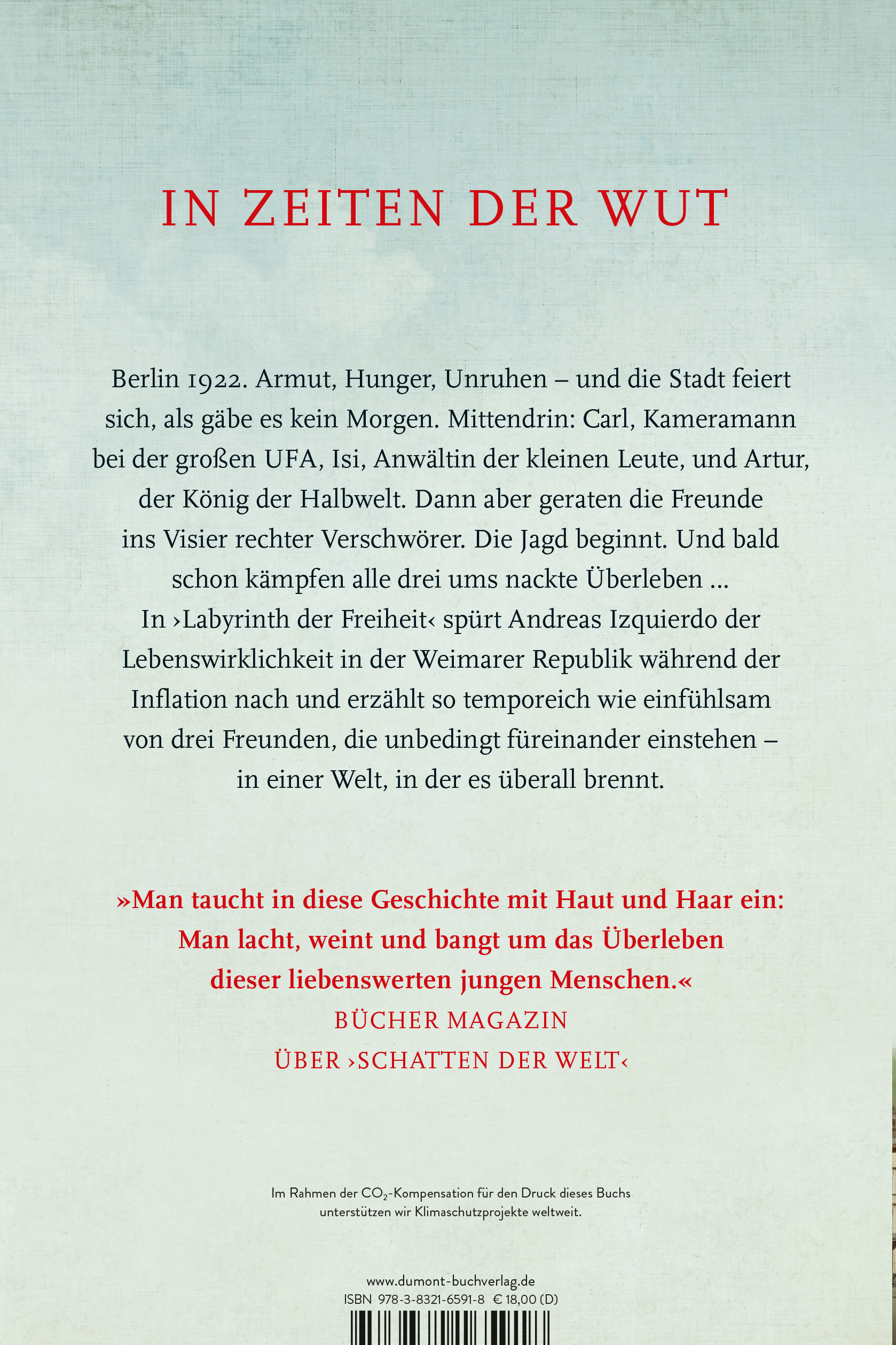 ANDREAS IZQUIERDO ist Schriftsteller und Drehbuchautor. Er veröffentlichte den mit dem Sir-Walter-Scott-Preis ausgezeichneten historischen Roman ›König von Albanien‹ (Neuausgabe DuMont 2024) und zahlreiche weitere Romane, u. a. den SPIEGEL-Bestseller ›Der Club der Traumtänzer‹ (2014) und ›Fräulein Hedy träumt vom Fliegen‹ (2018). Zuletzt erschien die ›Wege der Zeit‹-Trilogie, die die Bände ›Schatten der Welt‹ (2020), ›Revolution der Träume‹ (2021) und ›Labyrinth der Freiheit‹ (2022) umfasst. And