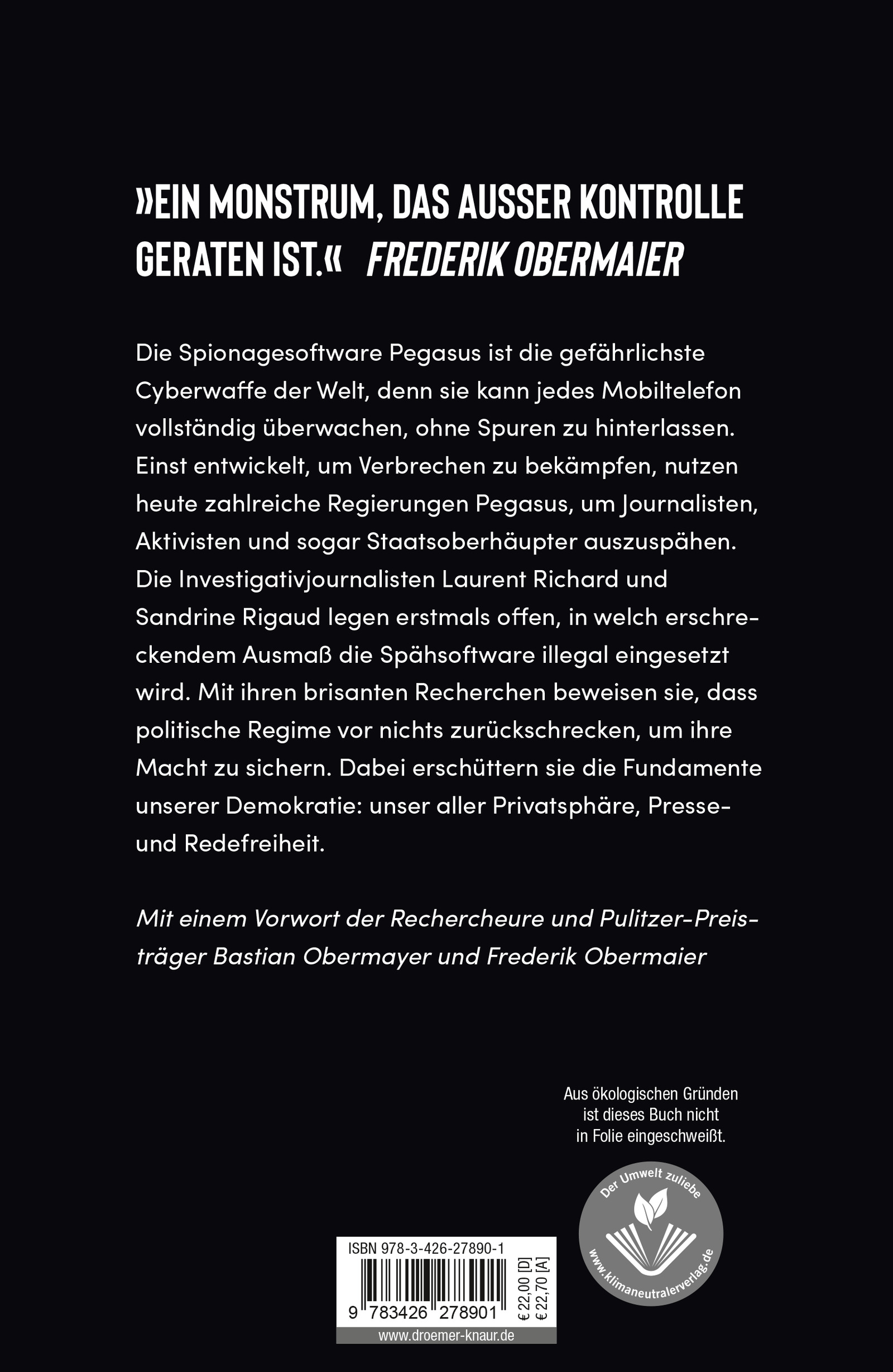 Die ausgezeichneten französischen Investigativ-Journalisten Laurent Richard und Sandrine Rigaud (Forbidden Stories) decken in ihrem Buch erstmals das ganze Ausmaß der Pegasus-Affäre auf und enthüllen, wer wirklich hinter dem größten Spionage-Skandal seit der NSA-Affäre steckt. Sie gehen auf die Entwicklung der Technologie und auf die Geschichten der Menschen, die Opfer von Pegasus wurden, ein. Mit ihrem Insiderbericht geben sie einen Blick hinter die Kulissen ihrer brisanten Ermittlungen und beweisen, dass autoritäre Systeme vor nichts zurückschrecken, um ihre Macht zu sichern und auszubauen. Die gläserne Gesellschaft ist schon längst Realität geworden.