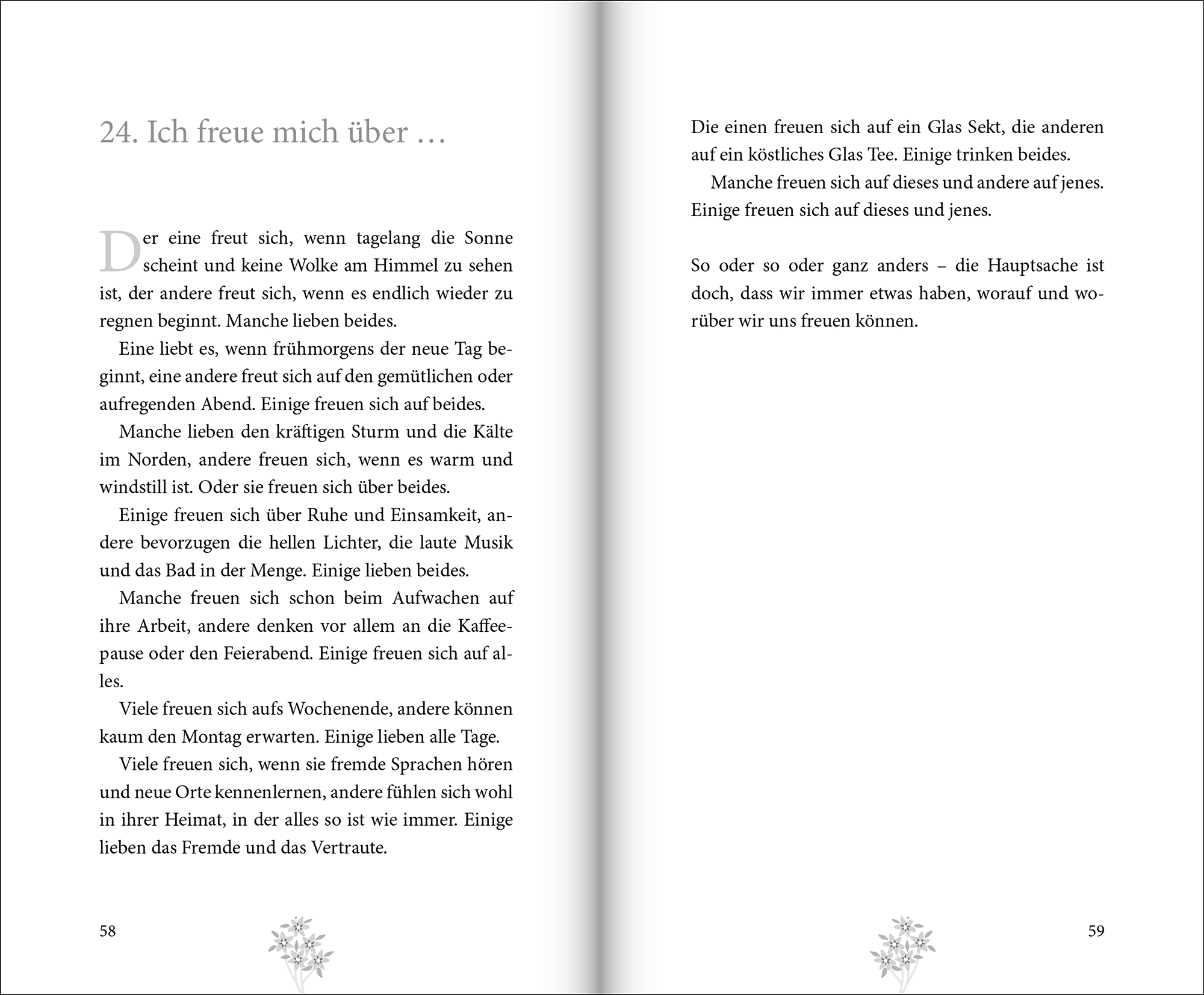 Was macht sie eigentlich aus, die »Freude« am Leben? Die meisten Menschen denken dabei an die außergewöhnlichen Momente des Lebens: die große Liebe, den Traumjob oder finanzielle Unabhängigkeit. Doch wenn wir uns nur darauf konzentrieren, laufen wir Gefahr, die vielen kleinen Glücksmomente des Alltags zu verpassen: den wunderschönen Sonnenaufgang, das liebe Wort vom Nachbarn, den Schmetterling, der uns mit seiner Leichtigkeit herausfordert, oder die guten Freunde, mit denen wir beschenkt sind.