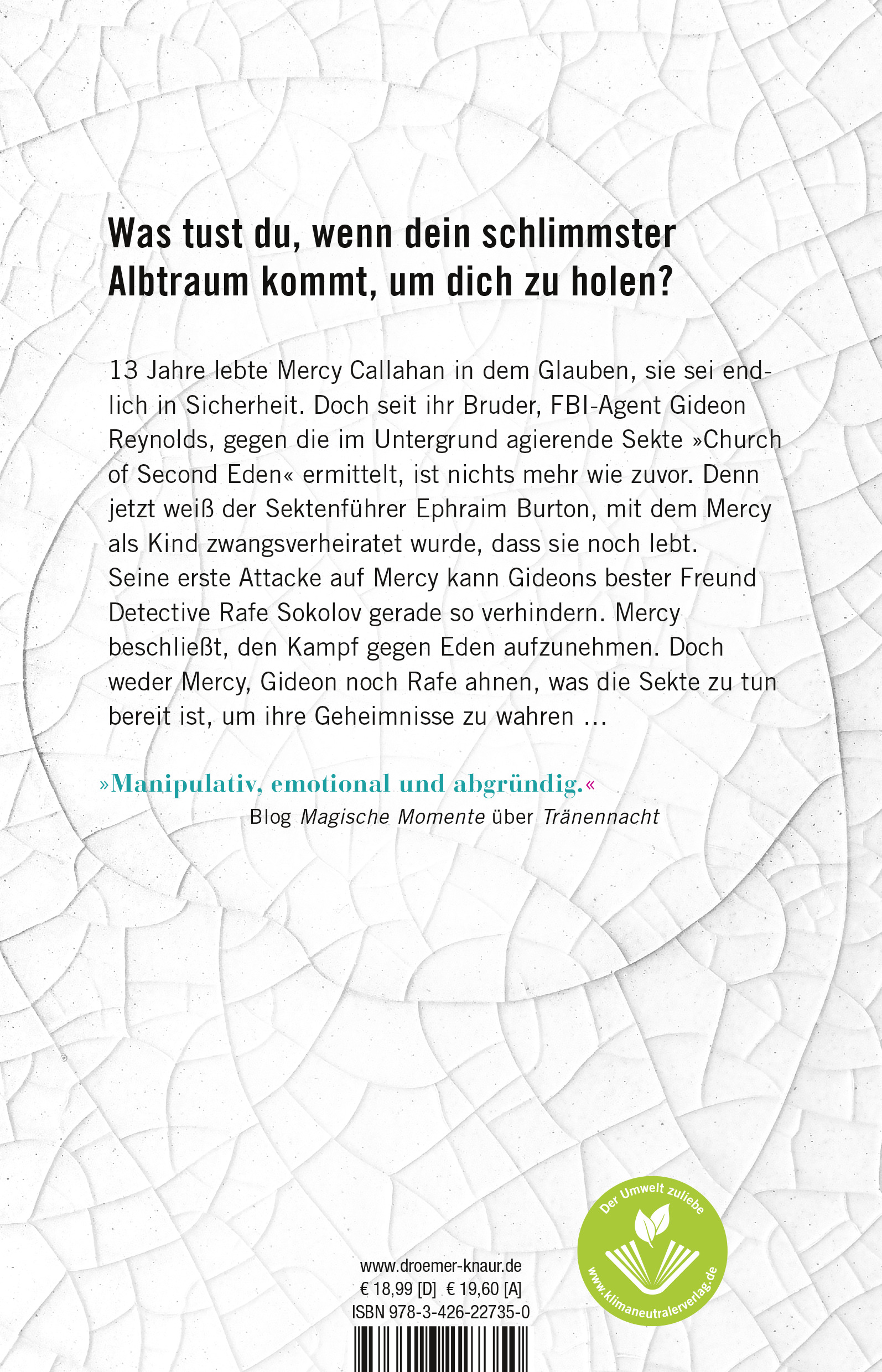 13 Jahre lebte Mercy Callahan in dem Glauben, sie sei endlich in Sicherheit. Doch seit ihr Bruder, FBI-Agent Gideon Reynolds, gegen die im Untergrund agierende Sekte »The Church of Second Eden« ermittelt, ist nichts mehr wie zuvor. Denn jetzt weiß der Sektenführer Ephraim Burton, mit dem Mercy als Kind zwangsverheiratet wurde, dass sie noch lebt. Und er hat mehr als einen guten Grund, das zu ändern.