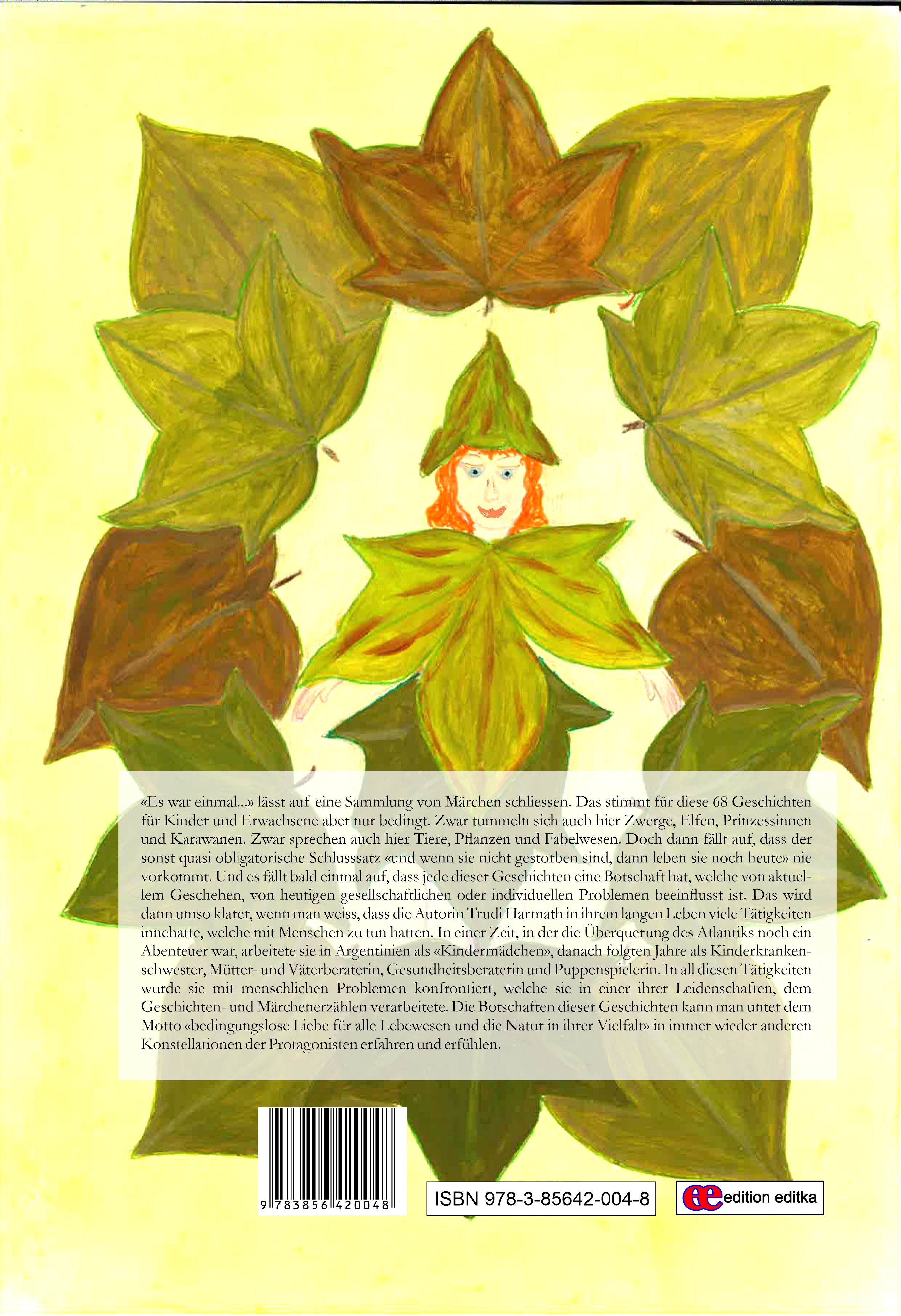 «Es war einmal...» lässt auf eine Sammlung von Märchen schliessen. Das stimmt für diese 68 Geschichten für Kinder und Erwachsene aber nur bedingt. Zwar tummeln sich auch hier Zwerge, Elfen, Prinzessinnen und Karawanen. Zwar sprechen auch hier Tiere, Pflanzen und Fabelwesen. Doch dann fällt auf, dass der sonst quasi obligatorische Schlusssatz «und wenn sie nicht gestorben sind, dann leben sie noch heute» nie vorkommt. Und es fällt bald einmal auf, dass jede dieser Geschichten eine Botschaft hat, welche von aktuellem Geschehen, von heutigen gesellschaftlichen oder individuellen Problemen beeinflusst ist. Das wird dann umso klarer, wenn man weiss, dass die Autorin Trudi Harmath in ihrem langen Leben viele Tätigkeiten innehatte, welche mit Menschen zu tun hatten. In einer Zeit, in der die Überquerung des Atlantiks noch ein Abenteuer war, arbeitete sie in Argentinien als «Kindermädchen», danach folgten Jahre als Kinderkrankenschwester, Mütter- und Väterberaterin, Gesundheitsberaterin und Puppenspielerin. In all diesen Tätigkeiten wurde sie mit menschlichen Problemen konfrontiert, welche sie in einer ihrer Leidenschaften, dem Geschichten- und Märchenerzählen verarbeitete. Die Botschaften dieser Geschichten kann man unter dem Motto «bedingungslose Liebe für alle Lebewesen und die Natur in ihrer Vielfalt» in immer wieder anderen Konstellationen der Protagonisten erfahren und erfühlen.