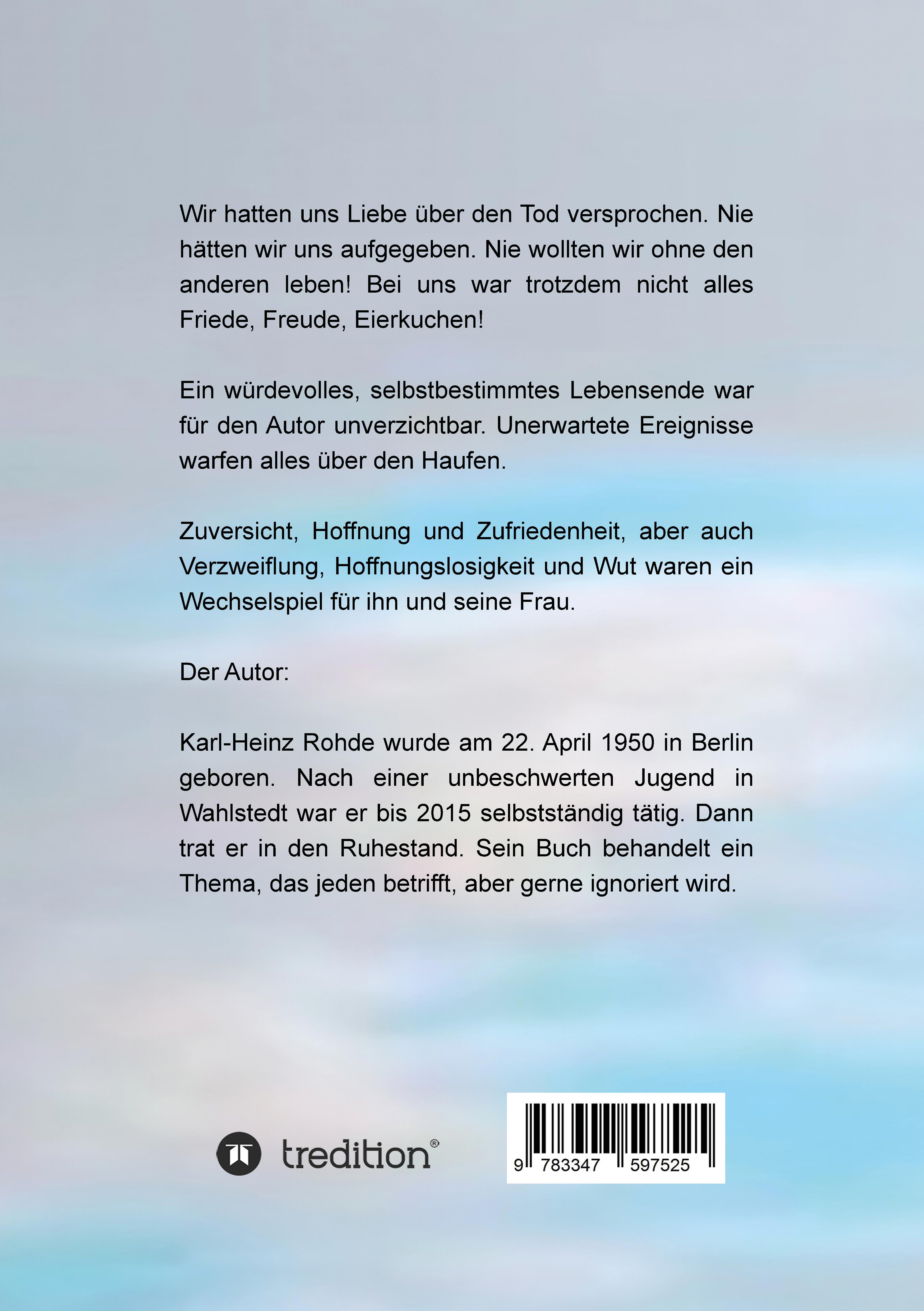 Um die Lebensgeschichte und das 'Selbstbestimmte Lebensende' zweier Menschen.Sie waren gute Freunde. Daraus wuchs eine große Liebe über den Tod hinaus.Jetzt kämpfen sie um ein würdevolles selbst bestimmtes Lebensende.Das Buch beschreibt die Ereignisse und die Gemütslagen, die Hoffnung aber auch die Hoffnungslosigkeit sowie die Verzweiflung des Autors und seiner Ehefrau.Das Buch gibt auch einen Einblick in private Lebensbereiche.