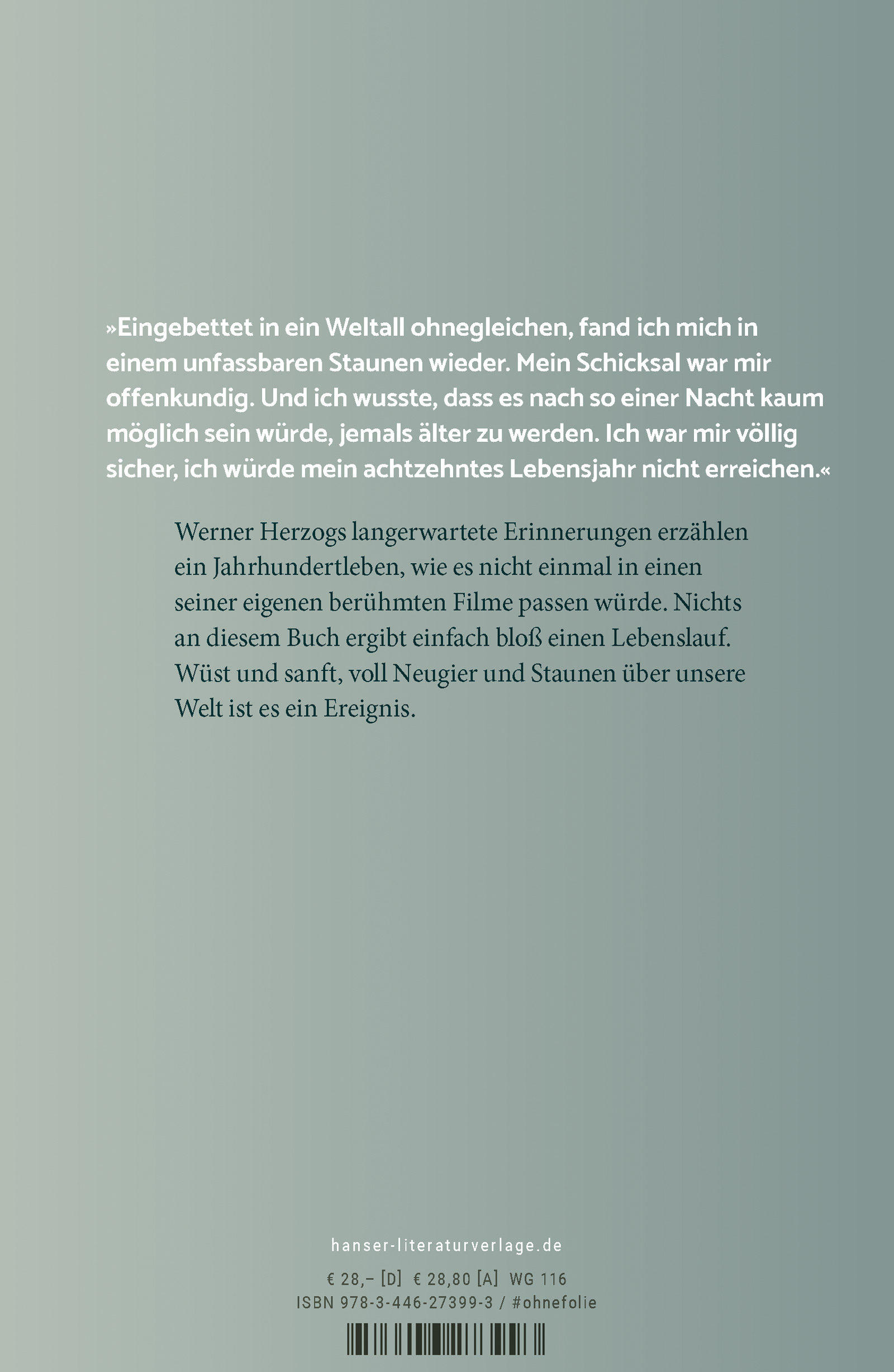 Werner Herzogs lang erwartete Erinnerungen erzählen ein Jahrhundertleben, wie es nicht einmal in einen seiner eigenen berühmten Filme passen würde. Ein immerzu hungriger Junge, mit der Mutter aus dem bombardierten München in ein bitterarmes Nest in den Alpen geflohen. Ein Jugendlicher, der ganz allein lostrampt und bald darauf im hintersten Ägypten im Fieberwahn auf den Tod wartet. Ein Liebender, ein Enthusiast, ein Getriebener: Ein Mann, der mitten im Dschungel leise auf den tobenden Klaus Kinski einredet, ein Mann, der weinend um seinen Freund Bruce Chatwin an dessen Sterbebett sitzt. Wüst und sanft, voller Lebensgier und Staunen über unsere Welt ist dieses Buch ein literarisches Ereignis.