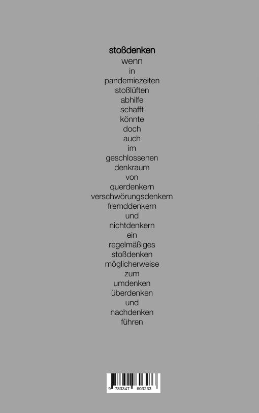 | Schlagworte | Aktuelle Zeit • Gedanken • Gedichte • Lyrik • Mensch • Nachdenkliches • Rührendes • Satirisches |