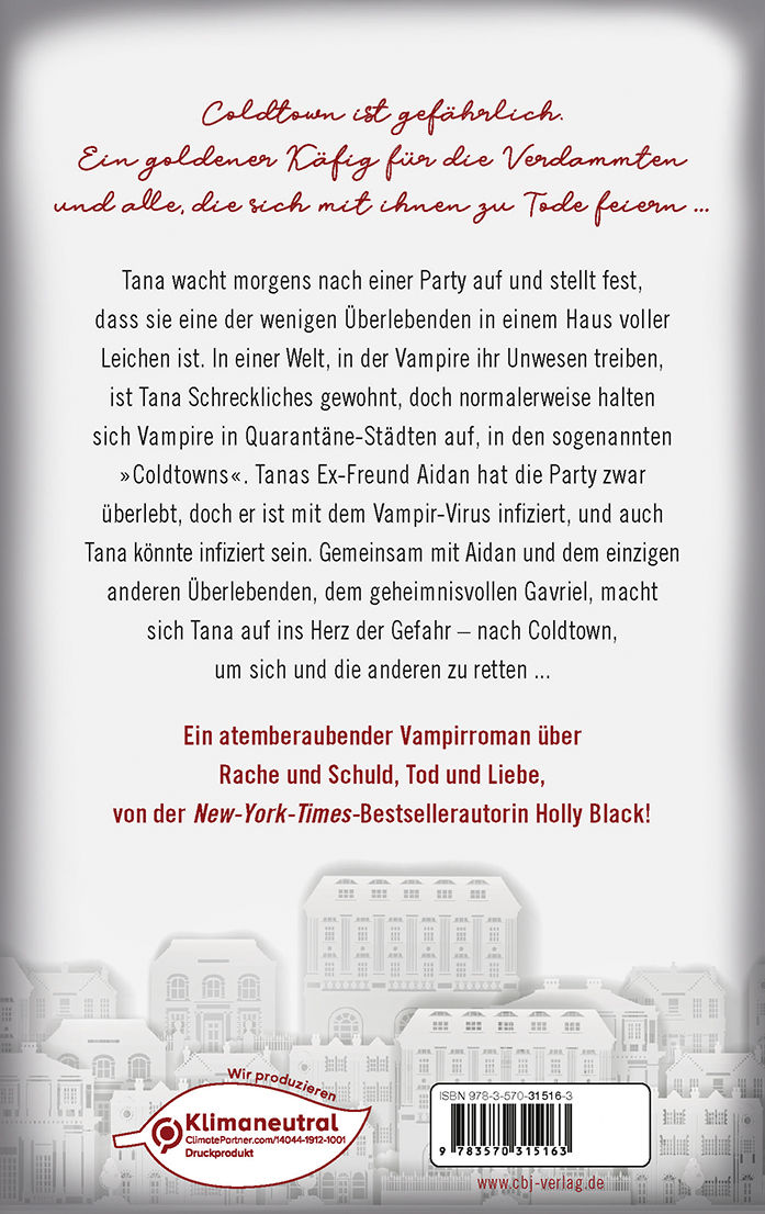 Tana wacht morgens nach einer Party auf und stellt fest, dass sie eine der wenigen Überlebenden in einem Haus voller Leichen ist. In einer Welt, in der Vampire ihr Unwesen treiben, ist Tana Schreckliches gewohnt, doch normalerweise halten sich Vampire in Quarantäne-Städten auf, in den sogenannten »Coldtowns«. Tanas Ex-Freund Aidan hat die Party zwar überlebt, doch er ist mit dem Vampir-Virus infiziert, und auch Tana könnte infiziert sein. Gemeinsam mit Aidan und dem einzigen anderen Überlebenden, dem geheimnisvollen Gavriel, macht sich Tana auf ins Herz der Gefahr - nach Coldtown, um sich und die anderen zu retten ...Ein atemberaubender Vampirroman über Rache und Schuld, Tod und Liebe, von der New-York-Times-Bestsellerautorin Holly Black!Holly Black bei cbj & cbtElfenkrone (Band 1)
