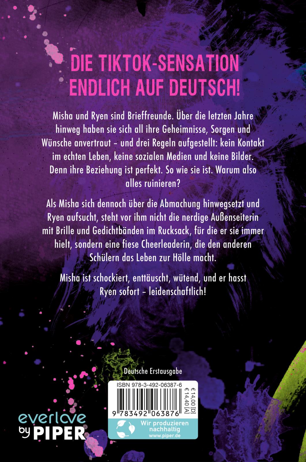 Misha und Ryen sind Brieffreunde. Sie haben sich über Jahre hinweg all ihre Geheimnisse, Sorgen und Wünsche anvertraut - und sie haben drei Regeln: kein Kontakt im echten Leben, keine sozialen Medien und keine Bilder. Denn das, was sie miteinander haben, ist perfekt. Warum es also ruinieren? Als Misha sich dennoch über die Abmachung hinwegsetzt und Ryen aufsucht, steht vor ihm nicht die nerdige Außenseiterin mit Brille und Gedichtbänden im Rucksack, für die er sie hielt, sondern eine fiese Cheerleaderin, die den anderen Schülern das Leben zur Hölle macht. Misha ist schockiert, enttäuscht, wütend, und er hasst Ryen sofort - leidenschaftlich!