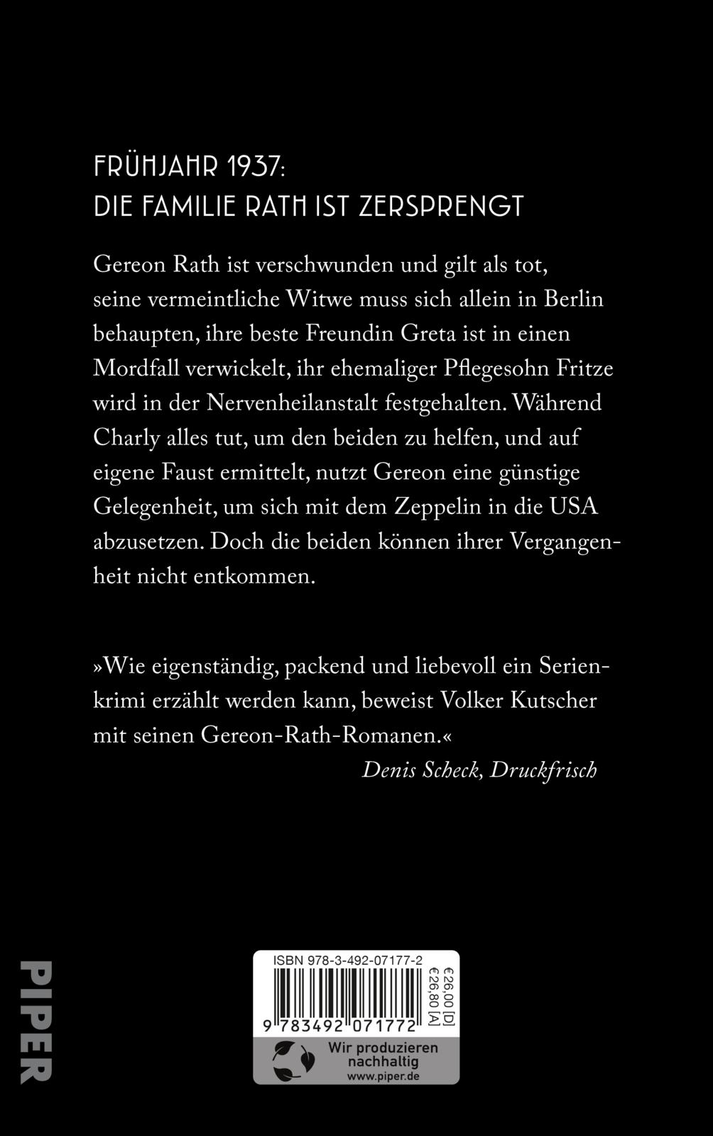 Frühjahr 1937: Eigentlich wollte Charlotte Rath, geborene Ritter, schon längst im Ausland sein, doch halten die Umstände sie in Berlin fest. Ihr ehemaliger Pflegesohn Fritze ist in die geschlossene Abteilung der Nervenheilanstalt Wittenau gesteckt worden, ihre beste Freundin Greta spurlos verschwunden und steht unter Mordverdacht. Dem untergetauchten und von den Behörden für tot gehaltenen Gereon Rath wird es derweil zu gefährlich in Deutschland, er besteigt den Zeppelin, um in die USA zu entkommen. Während Charly versucht, Fritze aus der Klinik rauszupauken, das Verschwinden von Greta zu klären und den Mordfall zu lösen, geschehen jenseits des Atlantiks Dinge, die sie niemals für möglich gehalten hätte.