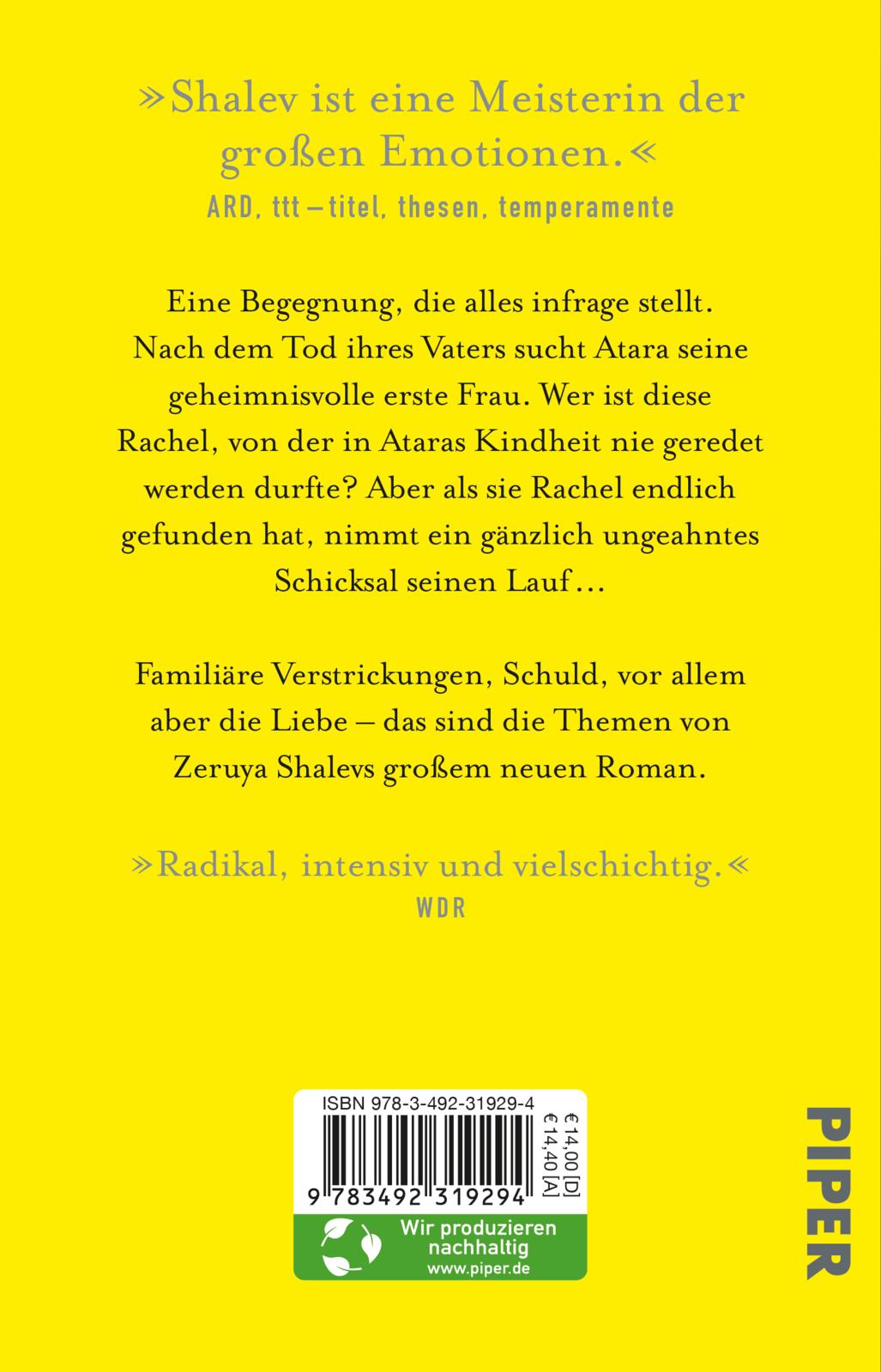 Eine Begegnung, die alles infrage stellt ...Atara ist zum zweiten Mal verheiratet, mit ihrer großen Liebe, doch neuerdings scheint Alex sich immer weiter von ihr zu entfernen. Noch größere Sorgen macht ihr der gemeinsame Sohn, ein Elitesoldat, der nach dem letzten Einsatz kaum mehr das Haus verlässt. Vielleicht um ihre Familie besser zu verstehen, vielleicht um ihr zu entkommen, sucht Atara Rachel auf, die erste Frau ihres Vaters, das große Tabu in Ataras Kindheit ... Die Idealistin Rachel scheint die Vergangenheit zu verkörpern - sie kämpfte mit dem Vater in der Untergrundmiliz gegen die Engländer und für einen israelischen Staat. Doch die Begegnung der beiden Frauen mündet in eine Katastrophe in der Gegenwart ... Meisterlich erzählt Zeruya Shalev eine große Geschichte von Liebe und Verantwortung.