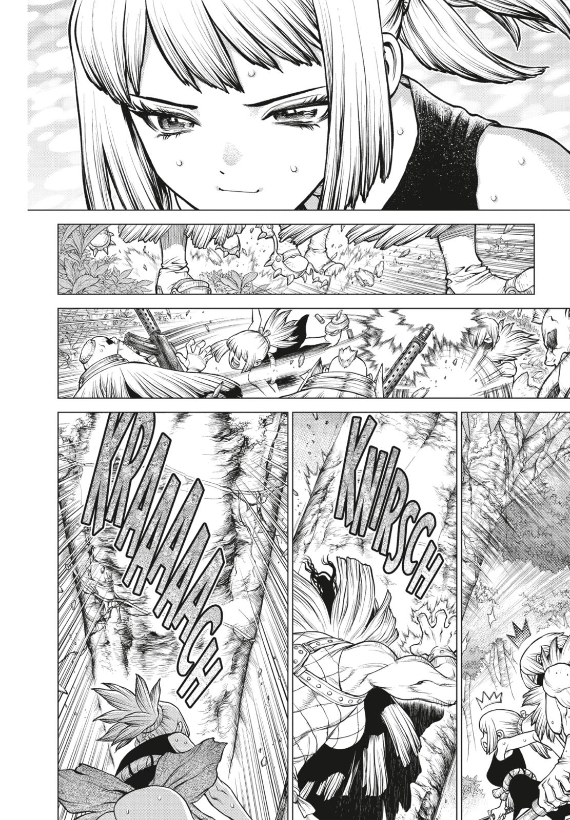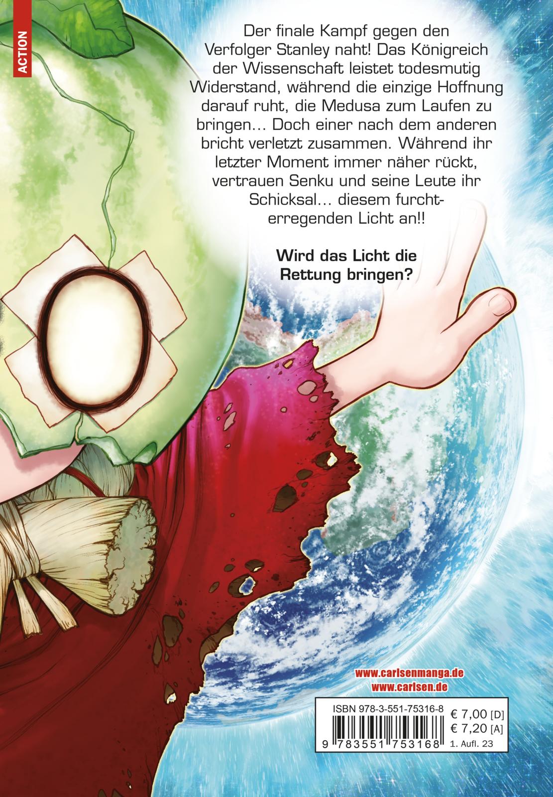 Der finale Kampf gegen den Verfolger Stanley naht! Das Königreich der Wissenschaft leistet todesmutig Widerstand, während die einzige Hoffnung darauf ruht, die Medusa zum Laufen zu bringen... Doch einer nach dem anderen bricht verletzt zusammen. Während ihr letzter Moment immer näher rückt, vertrauen Senku und seine Leute ihr Schicksal... diesem furchterregenden Licht an!!