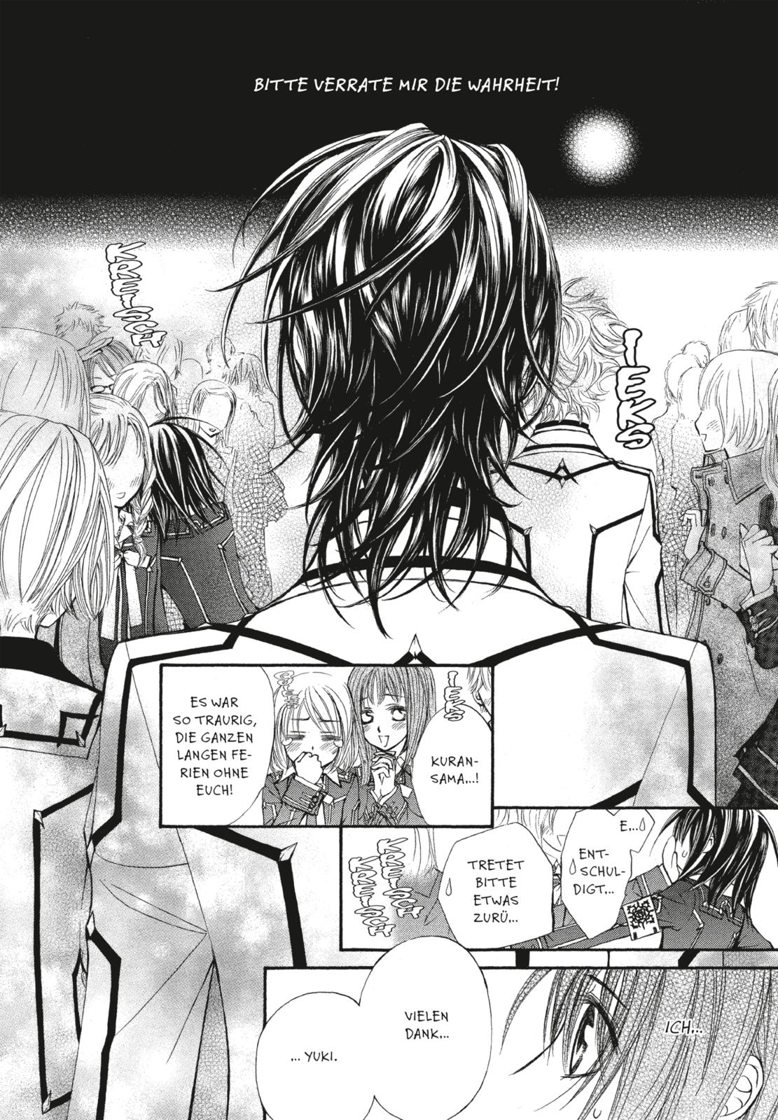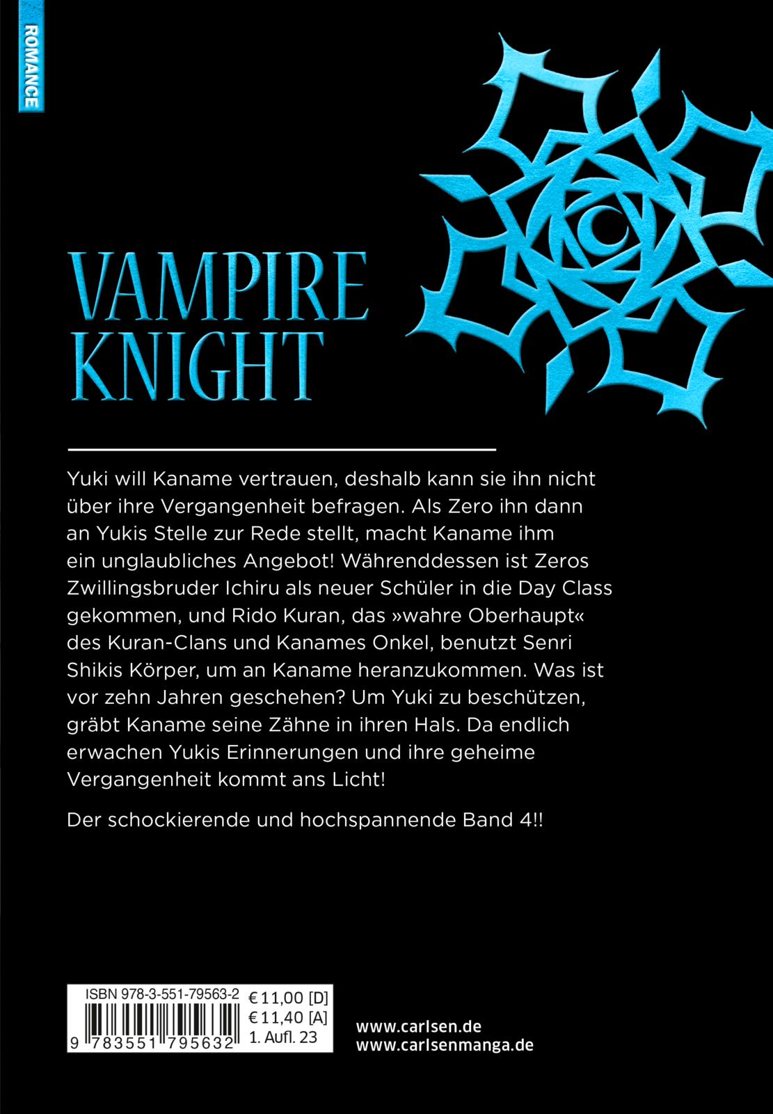 Yuki will Kaname vertrauen, deshalb kann sie ihn nicht über ihre Vergangenheit befragen. Als Zero ihn dann an Yukis Stelle zur Rede stellt, macht Kaname ihm ein unglaubliches Angebot! Währenddessen ist Zeros Zwillingsbruder Ichiru als neuer Schüler in die Day Class gekommen, und Rido Kuran, das »wahre Oberhaupt« des Kuran-Clans und Kanames Onkel, benutzt Senri Shikis Körper, um an Kaname heranzukommen. Was ist vor zehn Jahren geschehen? Um Yuki zu beschützen, gräbt Kaname seine Zähne in ihren Hals. Da endlich erwachen Yukis Erinnerungen und ihre geheime Vergangenheit kommt ans Licht! Der schockierende und hochspannende Band 4!!