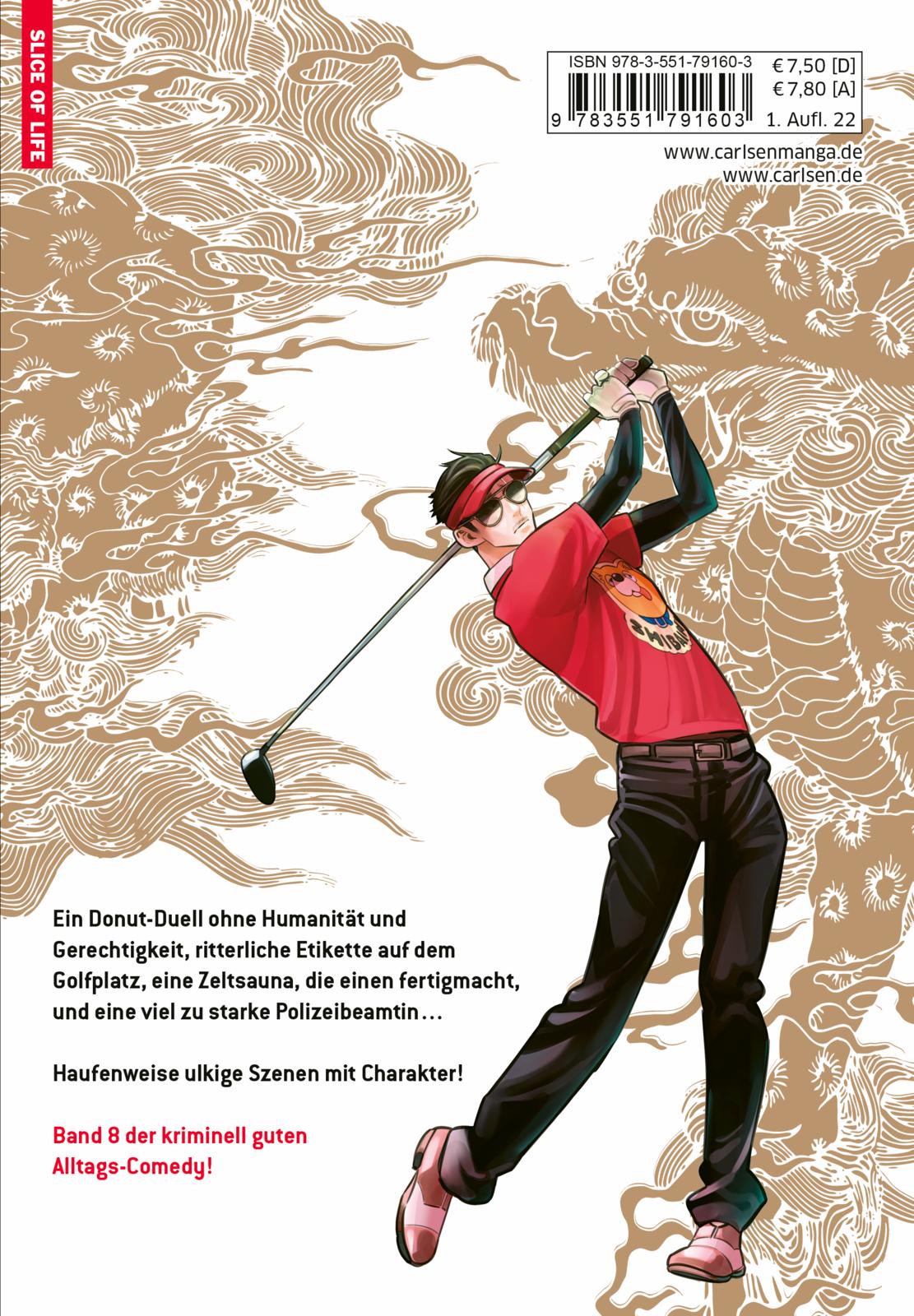 Ein Donut-Duell ohne Humanität und Gerechtigkeit, ritterliche Etikette auf dem Golfplatz, eine Zeltsauna, die einen fertigmacht, und eine viel zu starke Polizeibeamtin... Haufenweise ulkige Szenen mit Charakter! Band 8 der kriminell guten Alltags-Comedy!