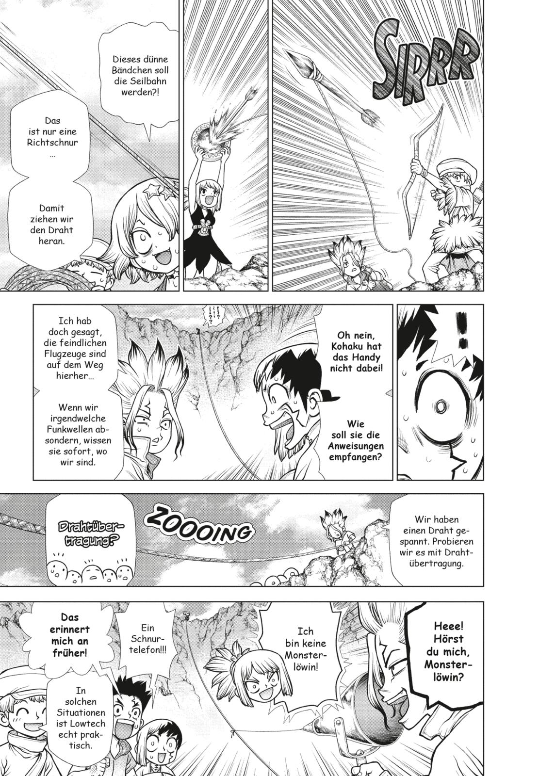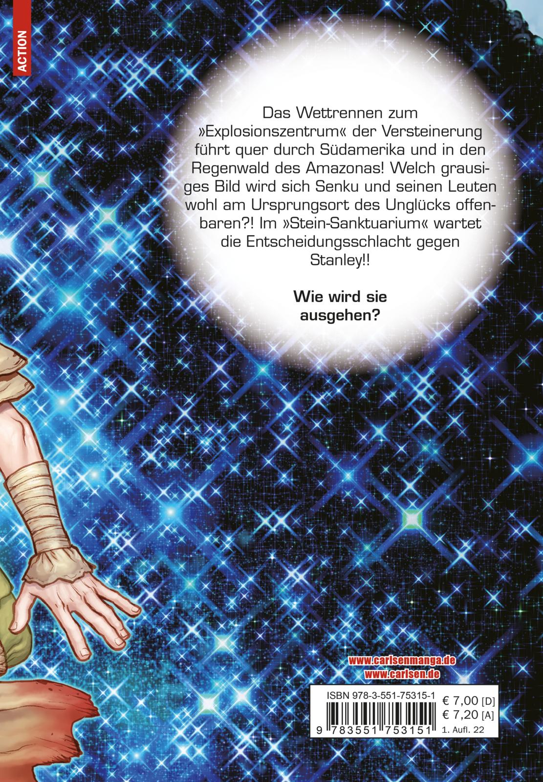 Das Wettrennen zum »Explosionszentrum« der Versteinerung führt quer durch Südamerika und in den Regenwald des Amazonas! Welch grausiges Bild wird sich Senku und seinen Leuten wohl am Ursprungsort des Unglücks offenbaren?! Im »Stein-Sanktuarium« wartet die Entscheidungsschlacht gegen Stanley!!