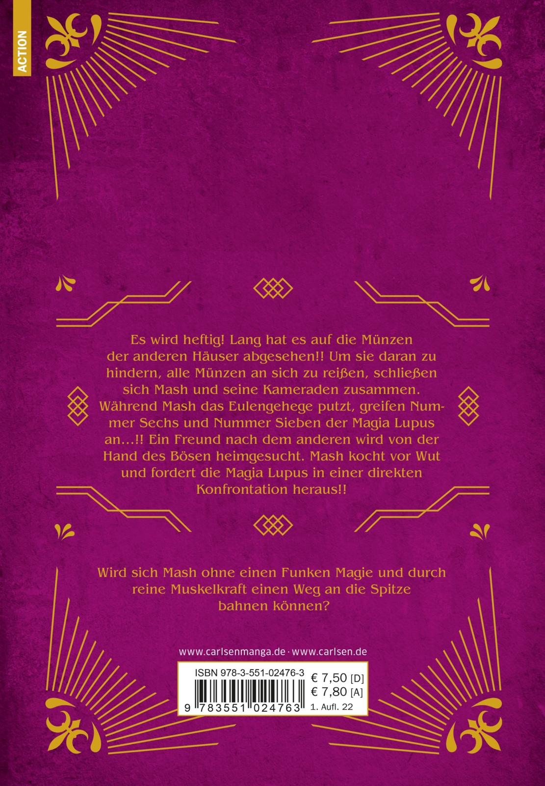 Es wird heftig! Lang hat es auf die Münzen der anderen Häuser abgesehen!! Um sie daran zu hindern, alle Münzen an sich zu reißen, schließen sich Mash und seine Kameraden zusammen. Während Mash das Eulengehege putzt, greifen Nummer Sechs und Nummer Sieben der Magia Lupus an...!! Ein Freund nach dem anderen wird von der Hand des Bösen heimgesucht. Mash kocht vor Wut und fordert die Magia Lupus in einer direkten Konfrontation heraus!!