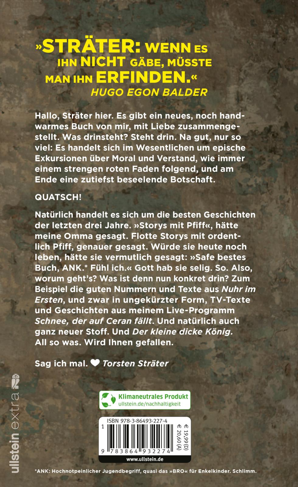 In echt: Ein neues Buch vom Meister. Es handelt sich hierbei um die besten Geschichten der letzten drei Jahre. Storys mit Pfiff. Eine Führung durch die ganze Welt der Idiotie, verbunden mit der Einsicht, dass nichts menschlicher ist als das Missgeschick. Ferner: seltsame Berichte vom Rand der schiefen Ebene. Schilderungen, die man sich auf gar keinen Fall verkneifen kann. Und zwischendurch paar Infos darüber, was sonst noch so war. Ein seriöses Konzept. Und Sträter gelobt, es sehr lustig zu gestalten.