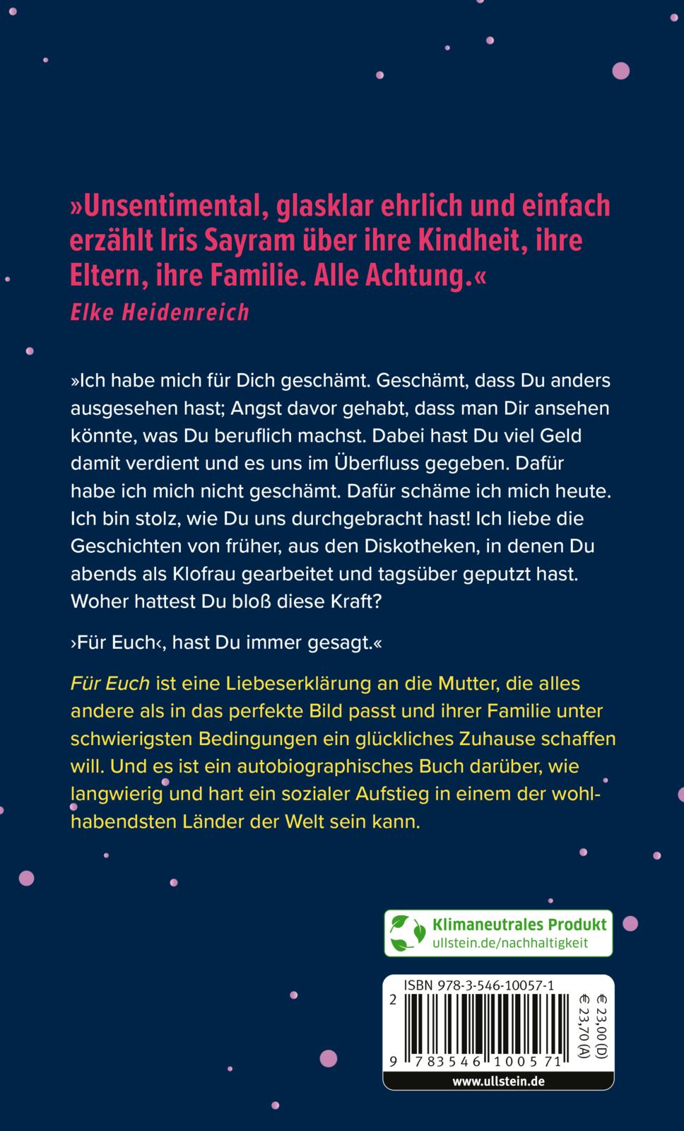 »Iris Sayrams Buch "Für Euch" ist eine beeindruckende Liebeserklärung an die Mutter, gleichzeitig Zeugnis dafür, wie hart es ist, in unserem wohlhabenden Land den sozialen Aufstieg zu schaffen.«