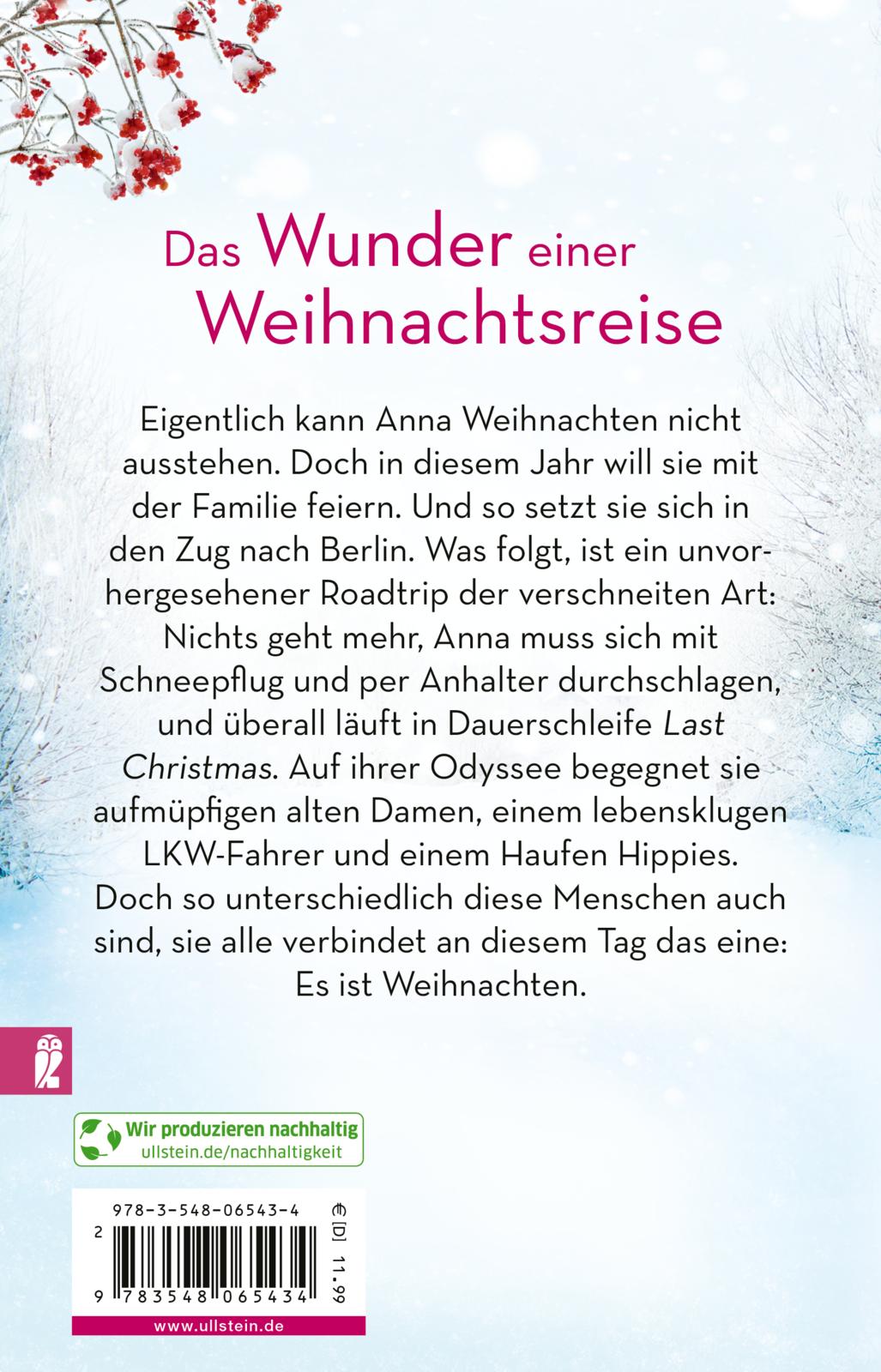 Eigentlich kann Anna Weihnachten nicht ausstehen. Doch in diesem Jahr will sie mit der Familie feiern. Und so setzt sie sich in den Zug nach Berlin. Was folgt, ist ein unvorhergesehener Roadtrip der verschneiten Art: Nichts geht mehr, Anna muss sich mit Schneepflug und per Anhalter durchschlagen, und überall läuft in Dauerschleife Last Christmas. Auf ihrer Odyssee begegnet sie aufmüpfigen alten Damen, einem lebensklugen LKW-Fahrer und einem Haufen Hippies. Doch so unterschiedlich diese Menschen auch sind, sie alle verbindet an diesem Tag das eine: Es ist Weihnachten.