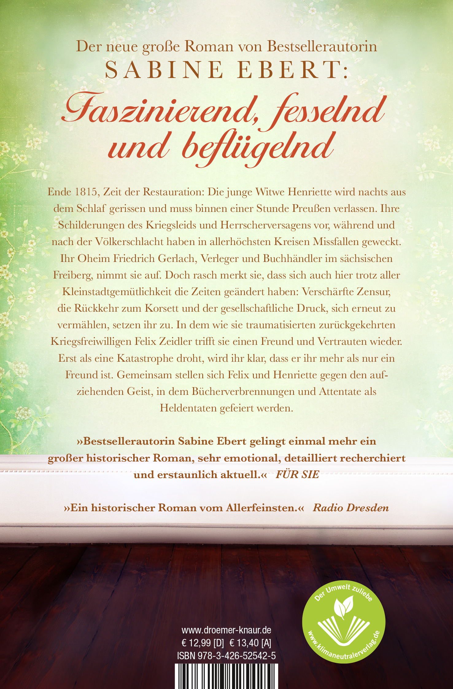 Ende 1815, Zeit der Restauration: Die junge Witwe Henriette wird nachts aus dem Schlaf gerissen und muss laut Polizeierlass binnen einer Stunde Preußen verlassen. Ihre Schilderungen des Kriegsleides und Herrscherversagens vor, während und nach der Völkerschlacht haben in allerhöchsten Kreisen Missfallen geweckt. Der Oheim Friedrich Gerlach, Verleger und Buchhändler im sächsischen Freiberg, nimmt sie auf. Doch rasch merkt sie, dass sich auch hier die Zeiten geändert haben: verschärfte Zensur, die Rückkehr zum Korsett und der gesellschaftliche Druck, sich wieder zu vermählen, setzen ihr zu. Mit der Rückkehr des wie sie traumatisierten Kriegsfreiwilligen Felix Zeidler trifft sie einen Freund und Vertrauten wieder. Doch erst nach einer drohenden Katastrophe wird ihr klar, dass er ihr mehr als nur ein Freund ist. Gemeinsam stellen sich Felix und Henriette gegen den aufziehenden Geist, in dem Bücherverbrennungen und Attentate als Heldentaten gefeiert werden.