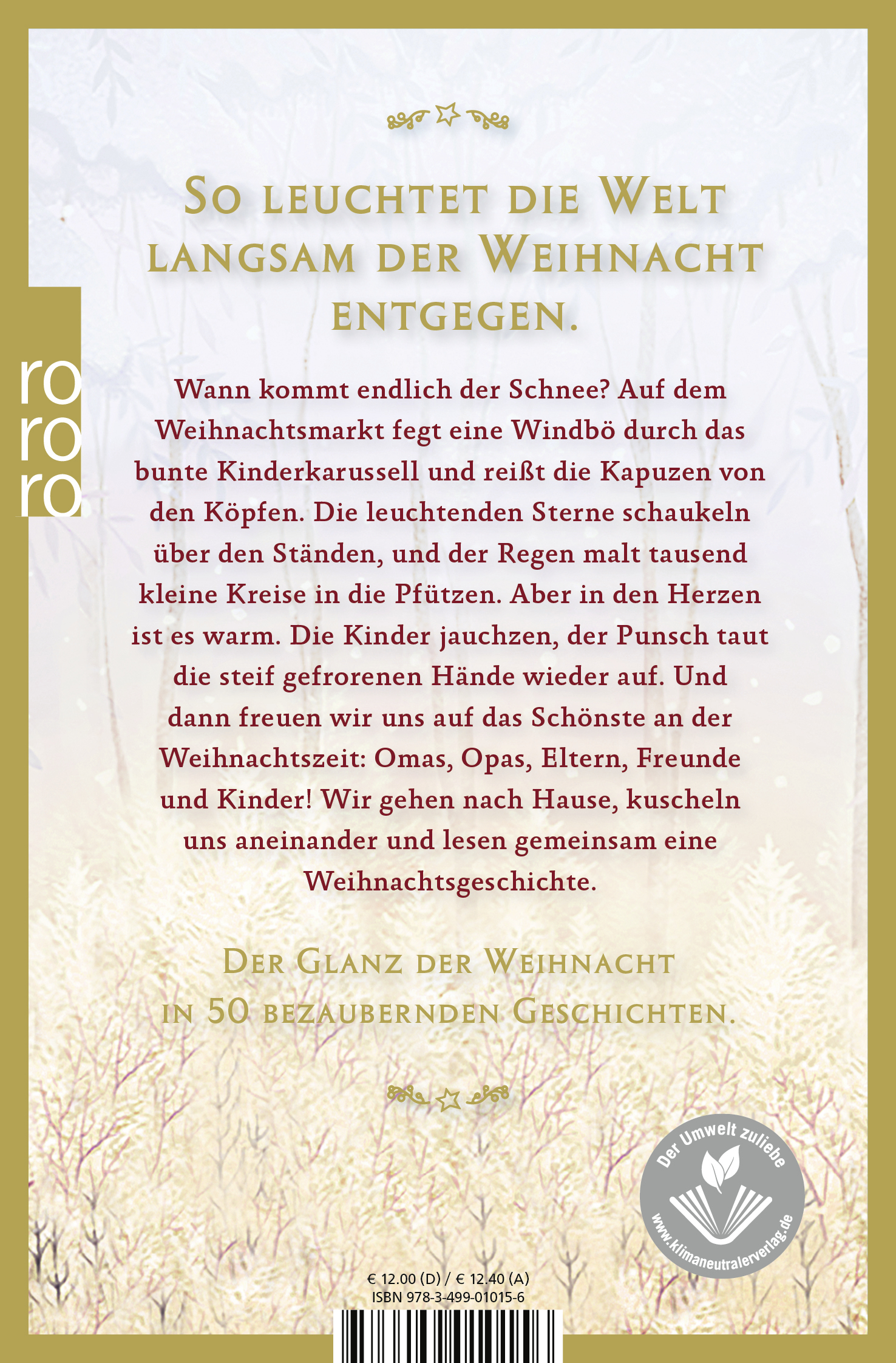 Wann kommt endlich der Schnee? Auf dem Weihnachtsmarkt herrscht geschäftiges Treiben. Manchmal fegt eine Windbö durch das bunte Kinderkarussell und reißt die Kapuzen von den Köpfen. Die leuchtenden Sterne schaukeln über den Ständen, und der Regen malt tausend kleine Kreise in die Pfützen. Aber in den Herzen ist es warm. Die Kinder jauchzen, der Punsch taut die steif gefrorenen Hände wieder auf. Und dann freuen wir uns auf das Schönste an der Weihnachtszeit: Omas, Opas, Eltern, Freunde und Kinder! Wir gehen nach Hause, kuscheln uns aneinander und lesen gemeinsam eine Weihnachtsgeschichte.