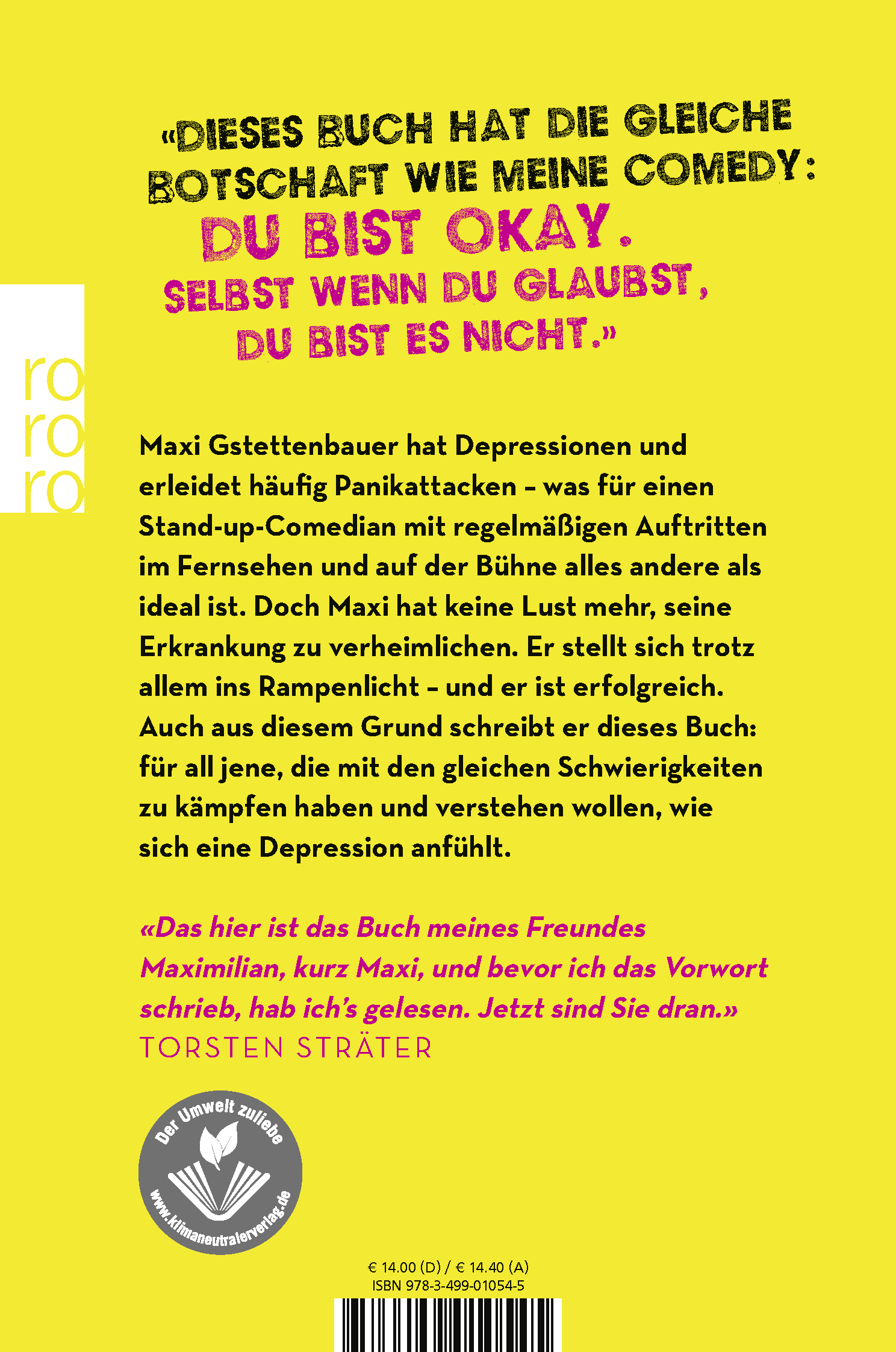 Maxi Gstettenbauer hat Depressionen und erleidet häufig Panikattacken - was für einen Stand-up-Comedian mit regelmäßigen Auftritten im Fernsehen und auf der Bühne keine ganz ideale Kombi ist. Dennoch: Maxi stellt sich ins Rampenlicht, ist erfolgreich, füllt Clubs und Hallen und hat keine Lust mehr, seine Erkrankung zu verheimlichen. Deshalb schreibt er dieses Buch: für all jene, die mit den gleichen Schwierigkeiten zu kämpfen haben, die verstehen wollen, wie sich eine Depression anfühlt. Und dabei wählt er eine Sprache, die seiner Comedy und seinem Publikum entspricht: klar, witzig, unverblümt und sehr unterhaltsam.