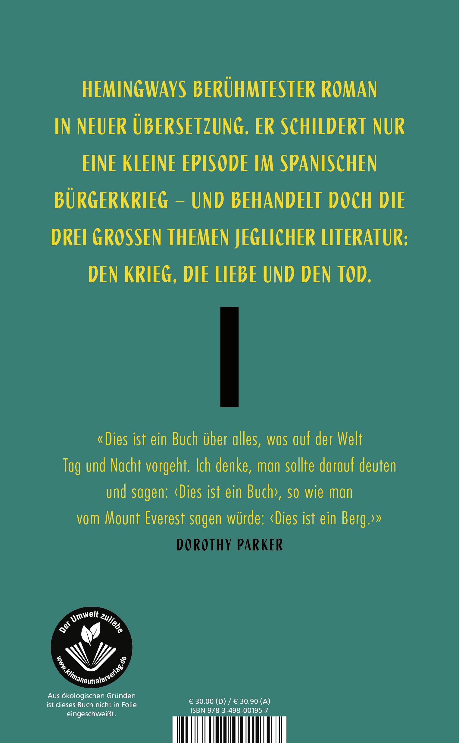 Der Roman wurde mit Ingrid Bergman und Gary Cooper verfilmt. Auf Deutsch erstmals 1941 im Stockholmer Exil bei Bermann Fischer veröffentlicht und nach dem Krieg vom Fischer Verlag verlegt, erscheint er nun mit dessen freundlicher Genehmigung in neuer Übersetzung bei Hemingways Hausverlag Rowohlt und vervollständigt die Neuausgaben wichtiger Werke des Autors.