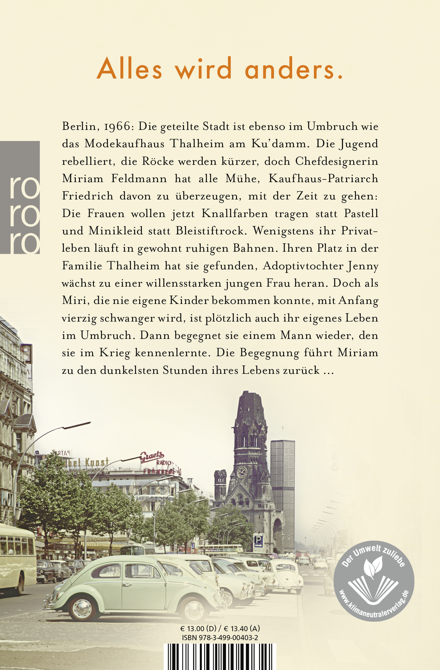 Berlin, 1966: Die geteilte Stadt ist ebenso im Umbruch wie das Modekaufhaus Thalheim am Ku'damm. Die Jugend rebelliert, die Röcke werden kürzer, doch Chefdesignerin Miriam Feldmann hat alle Mühe, Kaufhaus-Patriarch Friedrich davon zu überzeugen, mit der Zeit zu gehen: Die Frauen wollen jetzt Knallfarben tragen statt Pastell und Minikleid statt Bleistiftrock. Wenigstens Miris Privatleben läuft in gewohnt ruhigen Bahnen. Ihren Platz in der Familie Thalheim hat sie gefunden, Adoptivtochter Jenny wächst zu einer willensstarken jungen Frau heran. Doch als Miri, die nie eigene Kinder bekommen konnte, mit Anfang vierzig schwanger wird, ist plötzlich auch ihr eigenes Leben im Umbruch. Dann begegnet sie einem Mann wieder, den sie im Krieg kennenlernte. Die Begegnung führt Miriam zu den dunkelsten Stunden ihres Lebens zurück ...