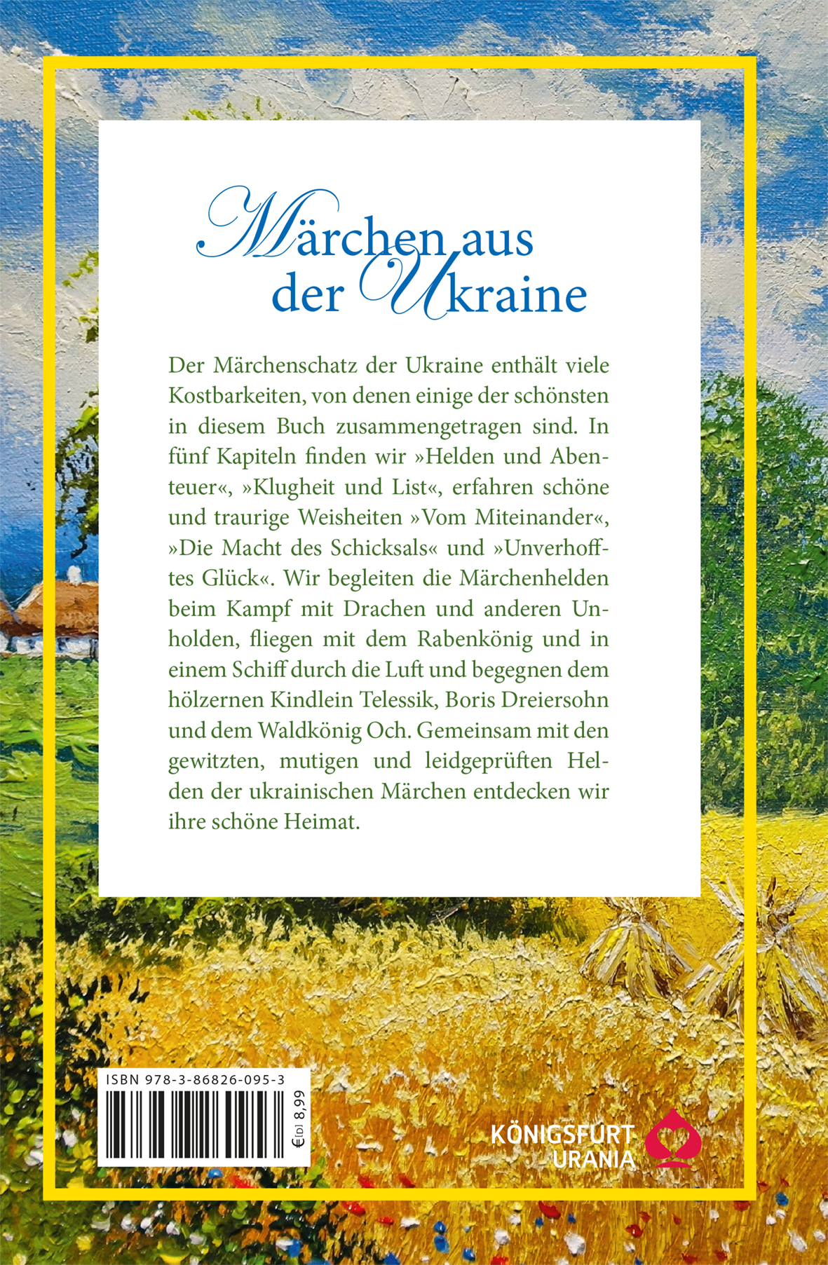 Märchen aus der UkraineDer Märchenschatz der Ukraine enthält viele Kostbarkeiten, von denen einige der schönsten in diesem Buch zusammengetragen sind. In fünf Kapiteln finden wir "Helden, und Abenteuer", "Klugheit und List", erfahren schöne und traurige Weisheiten "Vom Miteinander", "Die Macht des Schicksals" und "Unverhofftes Glück". Wir begleiten die Märchenhelden beim Kampf mit Drachen und anderen Unholden und in unterirdische Reiche, fliegen mit dem Rabenkönig und in einem Schiff durch die Luft und begegnen dem hölzernen Kindlein Telessik, Boris Dreiersohn, dem Waldkönig Och, den Sorgenkobolden und dem Strohstier. Gemeinsam mit den gewitzten, mutigen und leidgeprüften Helden der ukrainischen Märchen entdecken wir ihre schöne Heimat.