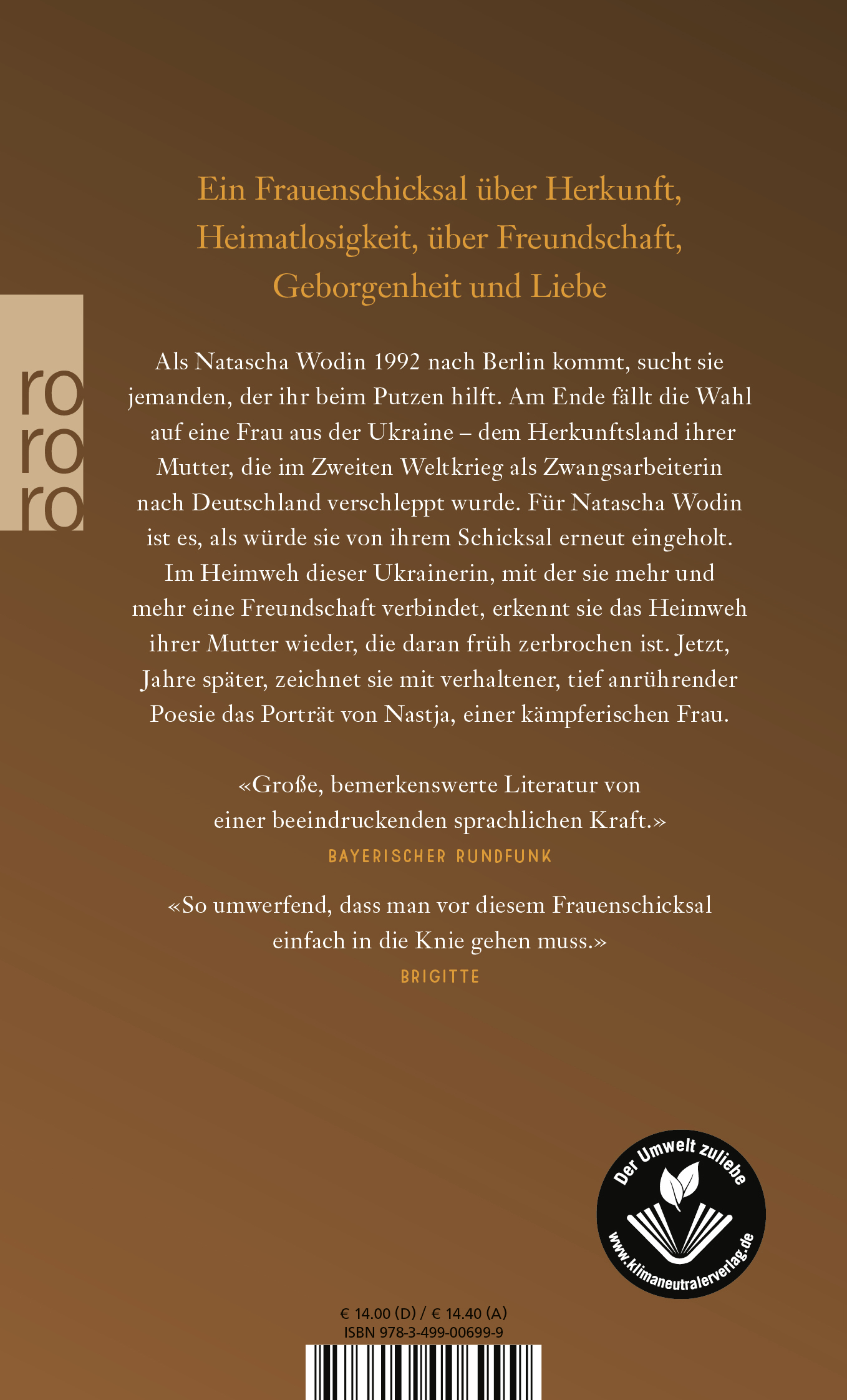 Als Natascha Wodin 1992 nach Berlin kommt, sucht sie jemanden, der ihr beim Putzen hilft. Am Ende fällt die Wahl auf eine Frau aus der Ukraine - dem Herkunftsland ihrer Mutter, die im Zweiten Weltkrieg als Zwangsarbeiterin nach Deutschland verschleppt wurde. Für Natascha Wodin ist es, als würde sie von ihrem Schicksal erneut eingeholt. Im Heimweh dieser Ukrainerin, mit der sie mehr und mehr eine Freundschaft verbindet, erkennt sie das Heimweh ihrer Mutter wieder, die daran früh zerbrochen ist. Jetzt, Jahre später, zeichnet sie mit verhaltener, tief anrührender Poesie das Porträt von Nastja, einer kämpferischen Frau.