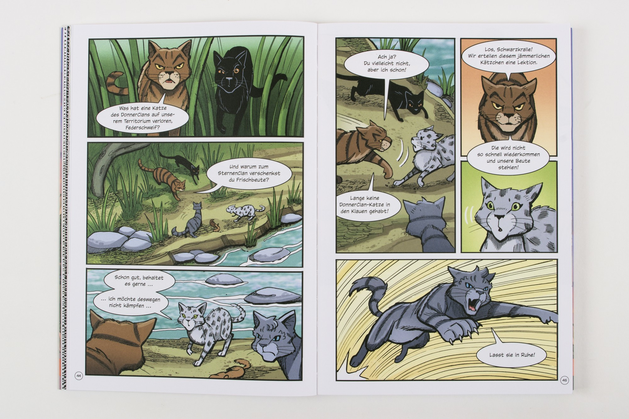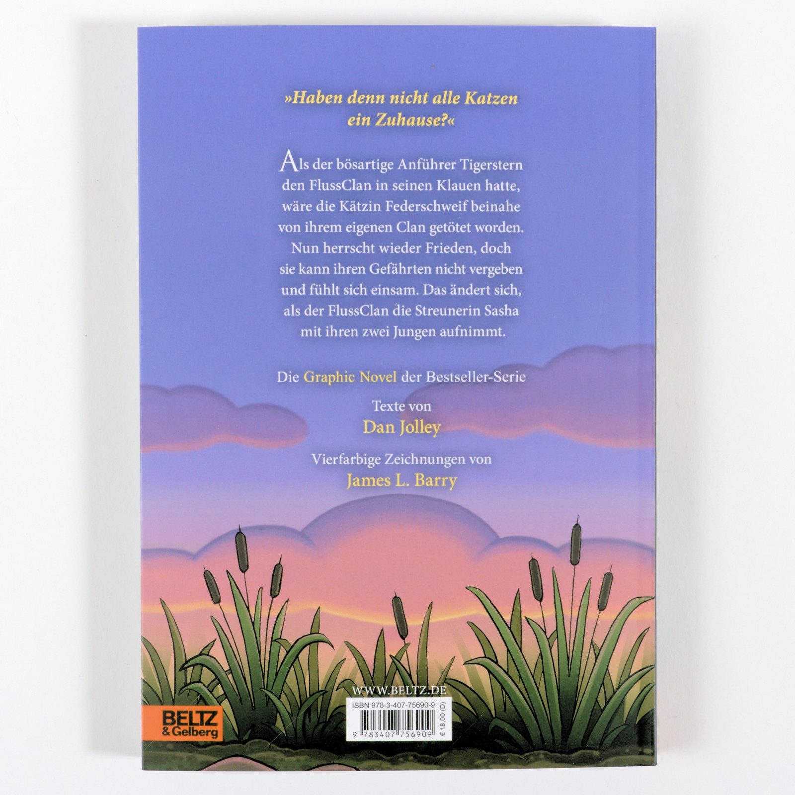 Seit uralten Zeiten leben tief verborgen im Wald vier wilde KatzenClans. Sie führen ein Leben voller Sehnsucht nach Freiheit, Abenteuer, Freundschaft - und dem Kampf ums Überleben. Die FlussClan-KätzinFederschweif wurde von seinem Clan beinahe getötet und kann ihrenGefährten nicht vergeben. Das ändert sich, als der FlussClan die Streunerin Sasha mit ihren zwei Jungen aufnimmt.Alle Katzen brauchen ein Zuhause, auch wenn sie wilde Krieger sind. Das, und wie Liebe alte Fehden besiegen kann, wird hier in vierfarbigen, dynamischen Bildern gefühlvoll und actionreich erzählt.