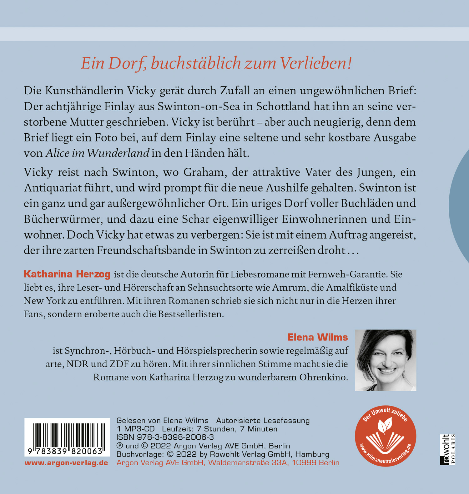 Die junge Kunsthändlerin Vicky gerät durch Zufall an einen ungewöhnlichen Brief: Der 10jährige Finlay aus Swinton in Schottland hat ihn an seine verstorbene Mutter geschrieben. Vicky ist berührt - aber auch neugierig, denn dem Brief liegt ein Foto bei, auf dem im Hintergrund eine seltene Ausgabe von "Alice im Wunderland" zu sehen ist. Sie reist nach Schottland - und entdeckt mit Swinton einen ganz und gar außergewöhnlichen Ort. Ein uriges Dorf voller Buchläden und Bücherwürmer, und dazu eine Schar mitunter sehr eigenwilliger Einwohnerinnen und Einwohner. Vicky gerät unversehens mitten in die Geschichte um Finlay, seinen Vater Graham - einen attraktiven Buchhändler und Witwer - und ein sehr wertvolles Buch ...