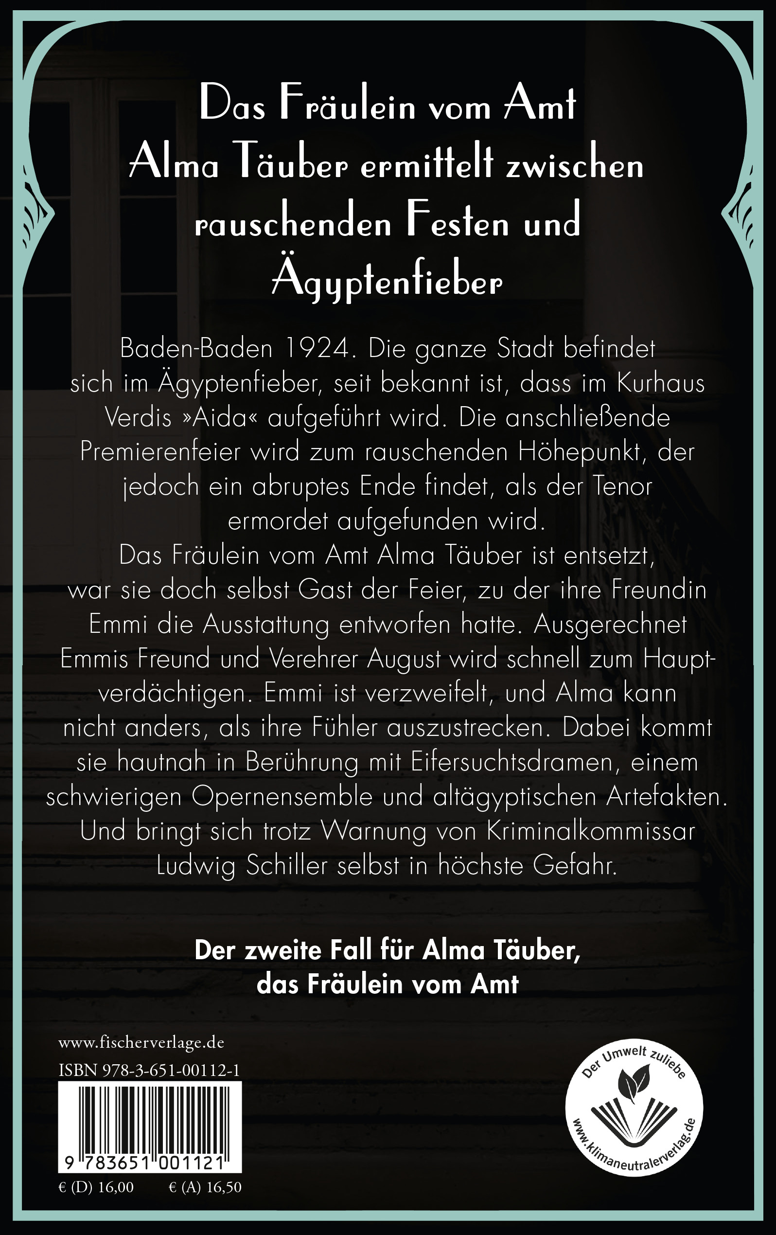 Das Fräulein vom Amt Alma Täuber ist entsetzt, war sie doch selbst Gast der Feier, zu der ihre Freundin Emmi die Ausstattung entworfen hatte. Und keine andere als Emmi wird nun Gegenstand der polizeilichen Ermittlungen. Alma, die kein Unrecht ertragen kann, streckt ihre Fühler aus, um Emmi zu helfen. Dabei kommt sie hautnah in Berührung mit Eifersuchtsdramen, einem schwierigen Opernensemble und altägyptischen Artefakten. Und bringt sich trotz Warnung von Kriminalkommissar Ludwig Schiller selbst in höchste Gefahr.