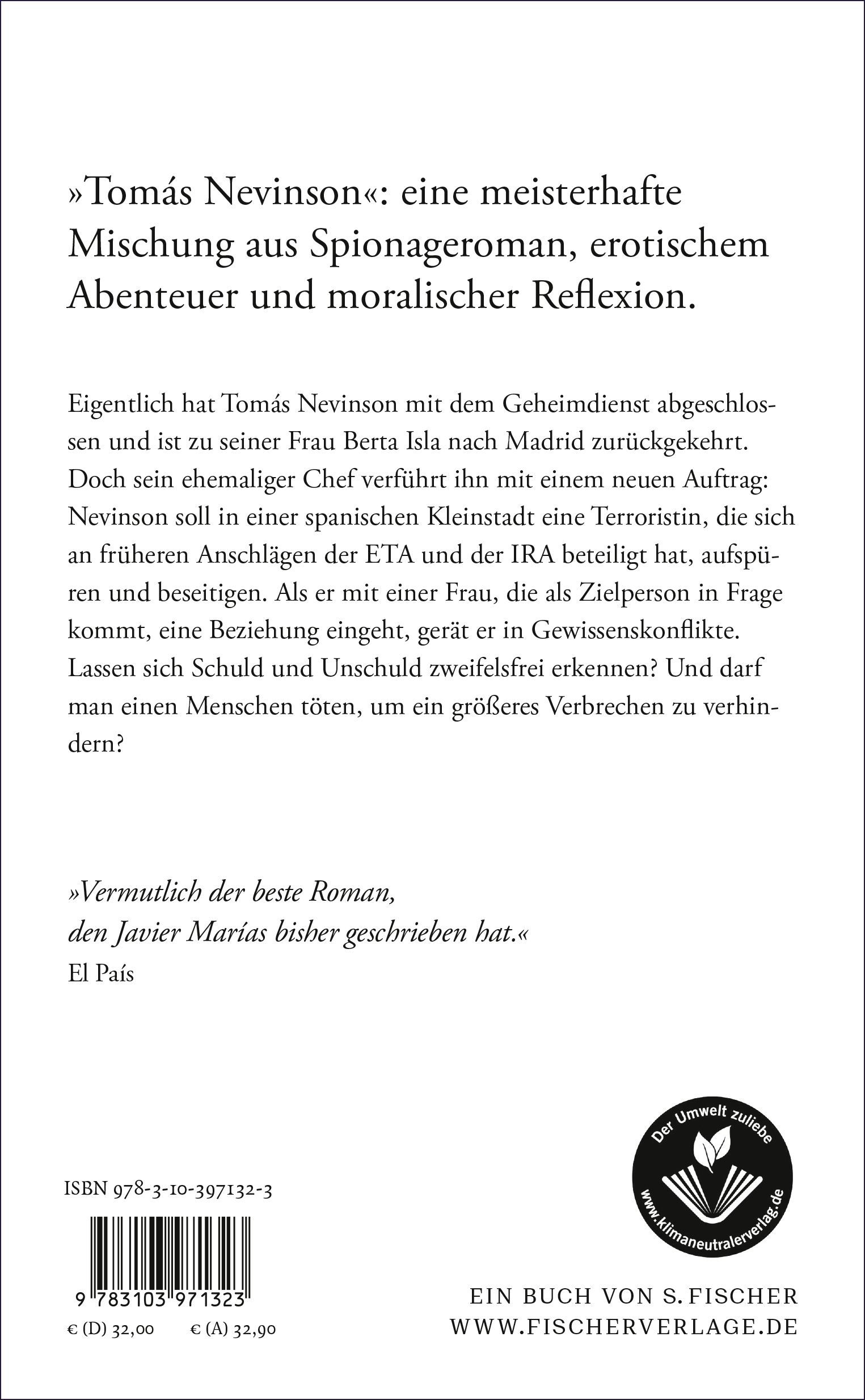»Tomás Nevinson« ist eine meisterhafte Mischung von Spionageroman, erotischem Abenteuer und moralischer Reflexion. »Vermutlich der beste Roman, den Javier Marías bisher geschrieben hat.« El País