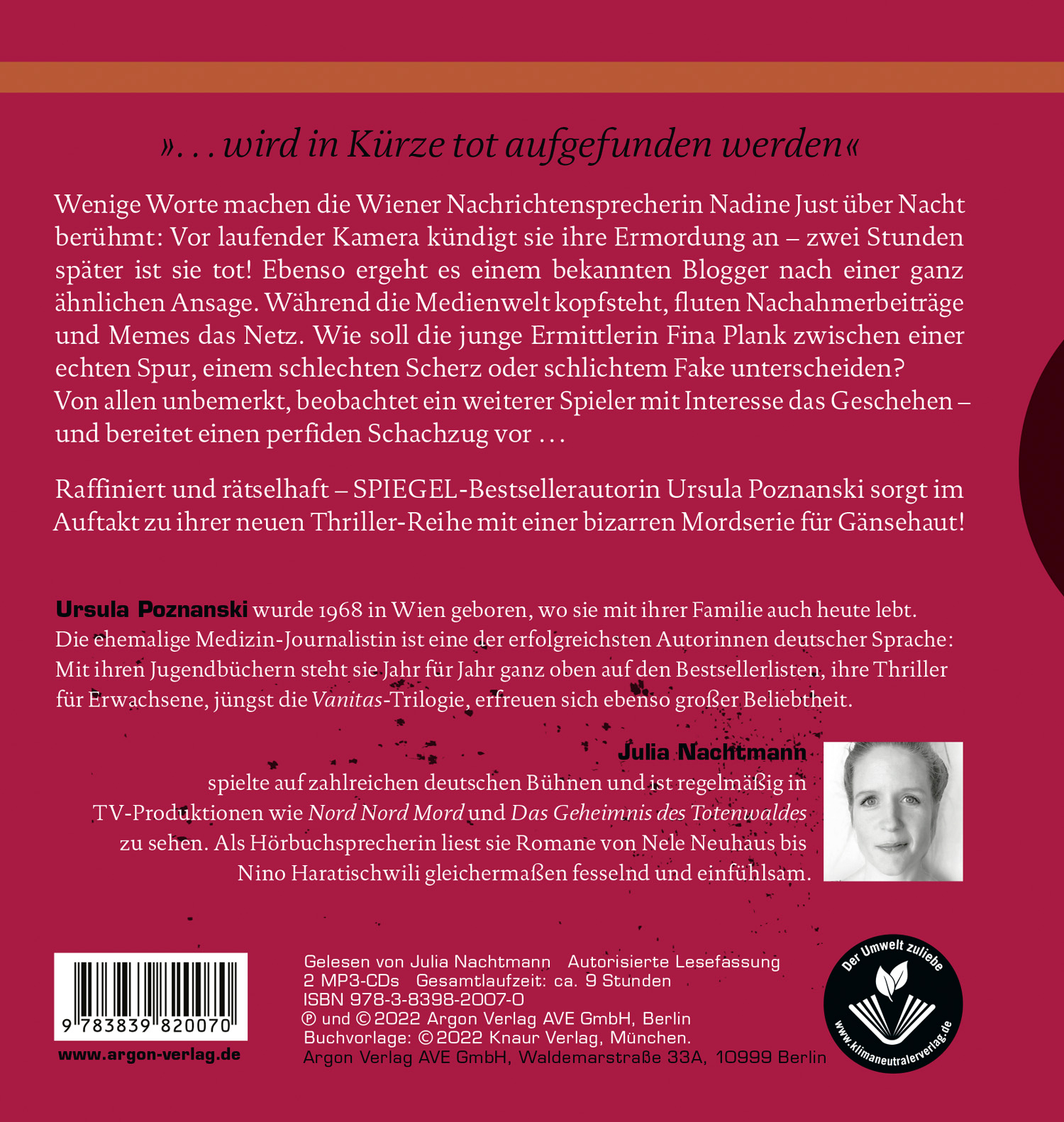 Wenige Worte machen die aufstrebende Wiener Nachrichtensprecherin Nadine Just über Nacht berühmt: Vor laufender Kamera kündigt sie ihre Ermordung an - zwei Stunden später ist sie tot! Ebenso ergeht es dem Blogger Gunther Marzik nach einer ganz ähnlichen Ankündigung. Während die österreichische Medienwelt kopfsteht, fluten Nachahmerbeiträge und Memes das Netz. Wie soll Fina Plank, die junge Ermittlerin der Wiener Mordgruppe, zwischen einer echten Spur, einem schlechten Scherz oder schlichtem Fake unterscheiden? Von allen unbemerkt beobachtet ein weiterer Spieler mit Interesse das Geschehen - und bereitet einen raffinierten Schachzug vor ...