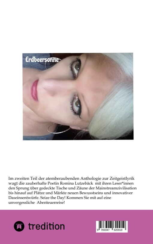 Romina Lutzebäck ist eine muntere und erfolgreiche junge spirituelle Poetin und Performerin, die nach aufregenden Wanderjahren in Berlin zur Zeit - verschnaufend bei den Möwen in Kiel an der Ostsee- lacht, schreibt und liebt. Zeitgeist-Lyrik, Romane, Kurzprosa und Ideen für Drehbücher sind der psychotherapeutischen Heilpraktikerin und Pädagogin ein besonderes Herzensanliegen... Seize the day!