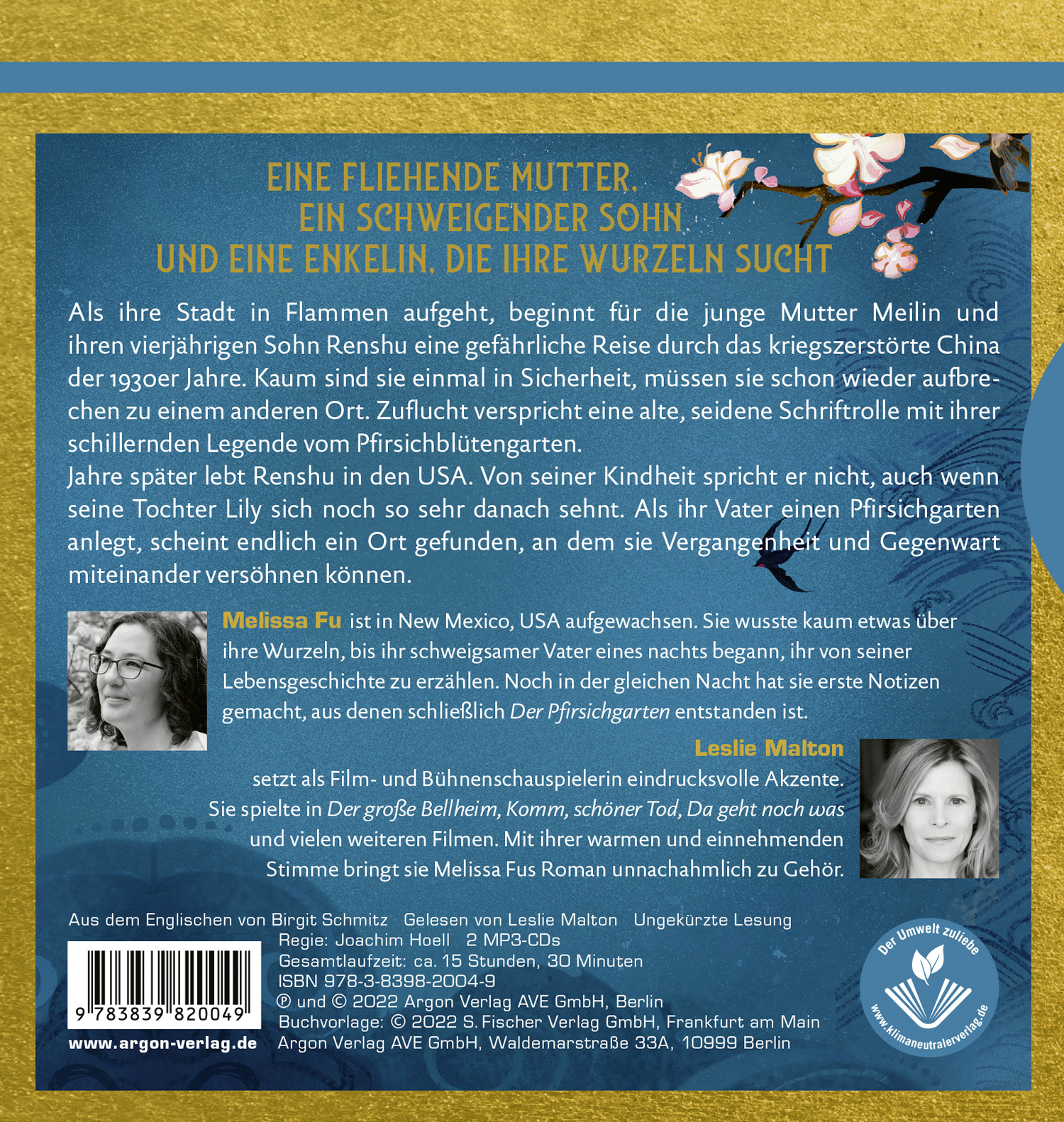 Als ihre Stadt in Flammen aufgeht, beginnt für die junge Mutter Meilin und ihren vierjährigen Sohn Renshu eine gefährliche Reise durch das kriegszerstörte China der 1930er-Jahre. Kaum sind sie einmal in Sicherheit, müssen sie schon wieder aufbrechen zu einem anderen Ort. Zuflucht verspricht allein eine alte, seidene Schriftrolle mit ihren feinen Zeichnungen und ihrer schillernden Legende vom Pfirsichblütengarten.