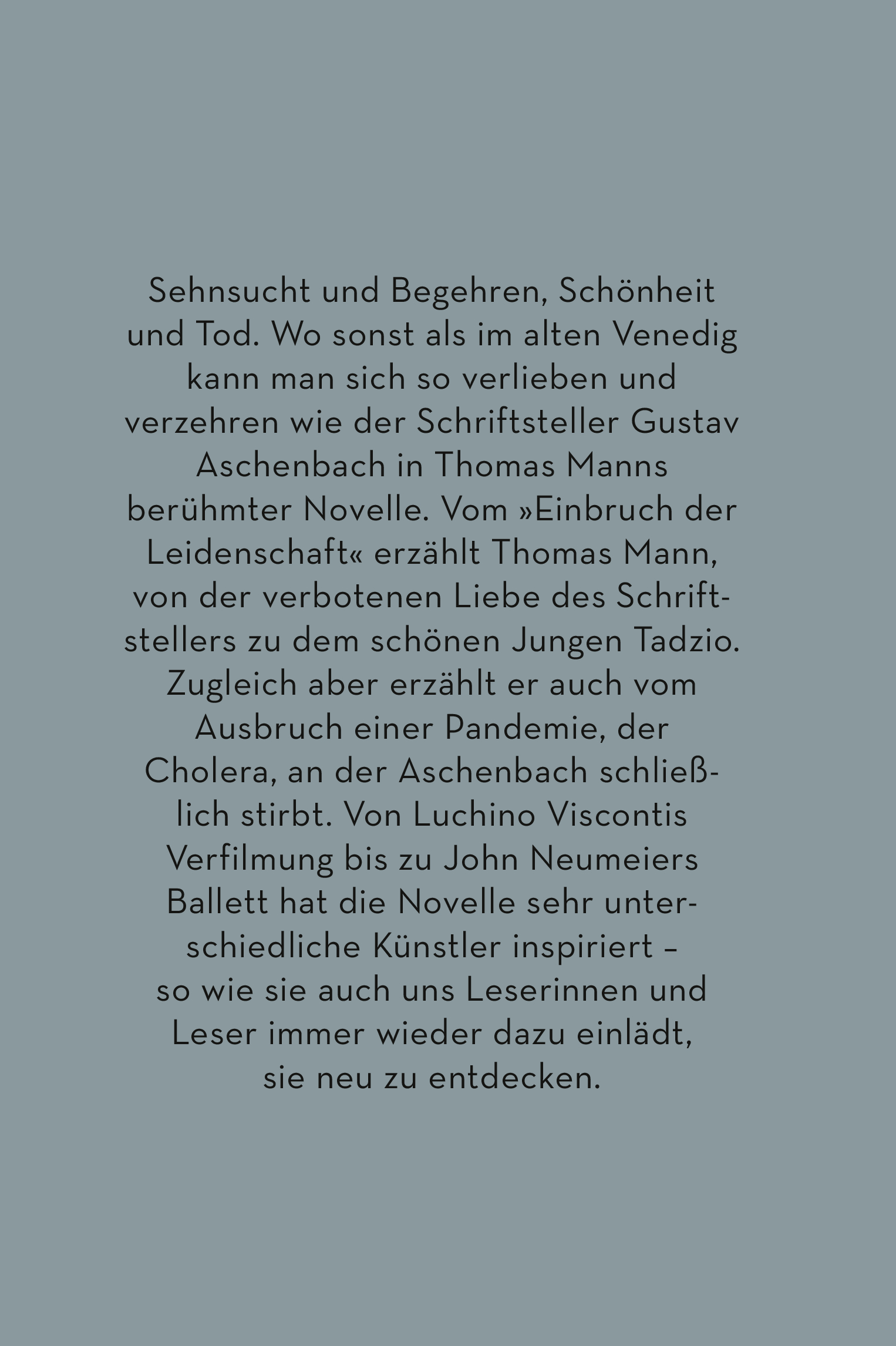 Sehnsucht und Begehren, Schönheit und Tod. Wo sonst als im alten Venedig kann man sich so verlieben und verzehren wie der Schriftsteller Gustav Aschenbach in Thomas Manns berühmter Novelle. Vom »Einbruch der Leidenschaft« erzählt Thomas Mann, von der verbotenen Liebe des Schriftstellers zu dem schönen Jungen Tadzio. Zugleich aber erzählt er auch vom Ausbruch einer Pandemie, der Cholera, an der Aschenbach schließlich stirbt. Von Luchino Viscontis Verfilmung bis zu John Neumeiers Ballett hat die Novelle sehr unterschiedliche Künstler inspiriert - so wie sie auch uns Leserinnen und Leser immer wieder dazu einlädt, sie neu zu entdecken.
