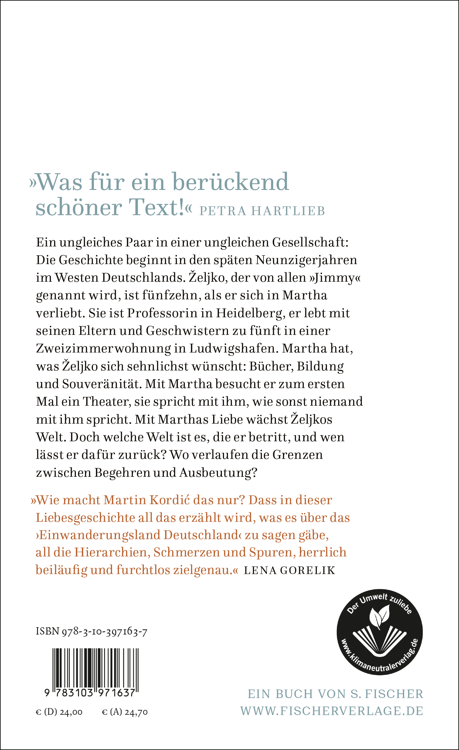 Zeljko, der von allen »Jimmy« genannt wird, ist fünfzehn, als er Martha begegnet. Sie ist Professorin in Heidelberg, er lebt mit seinen Eltern und Geschwistern zu fünft in einer Zweizimmerwohnung in Ludwigshafen. Martha hat, was Zeljko sich sehnlichst wünscht: Bücher, Bildung und Souveränität. Mit Martha besucht er zum ersten Mal ein Theater, sie spricht mit ihm, wie sonst niemand mit ihm spricht. Mit Marthas Zuneigung wächst Zeljkos Welt. Doch welche Welt ist es, die er da betritt und wen lässt er dafür zurück? Wo verlaufen die Grenzen zwischen Begehren und Ausbeutung?