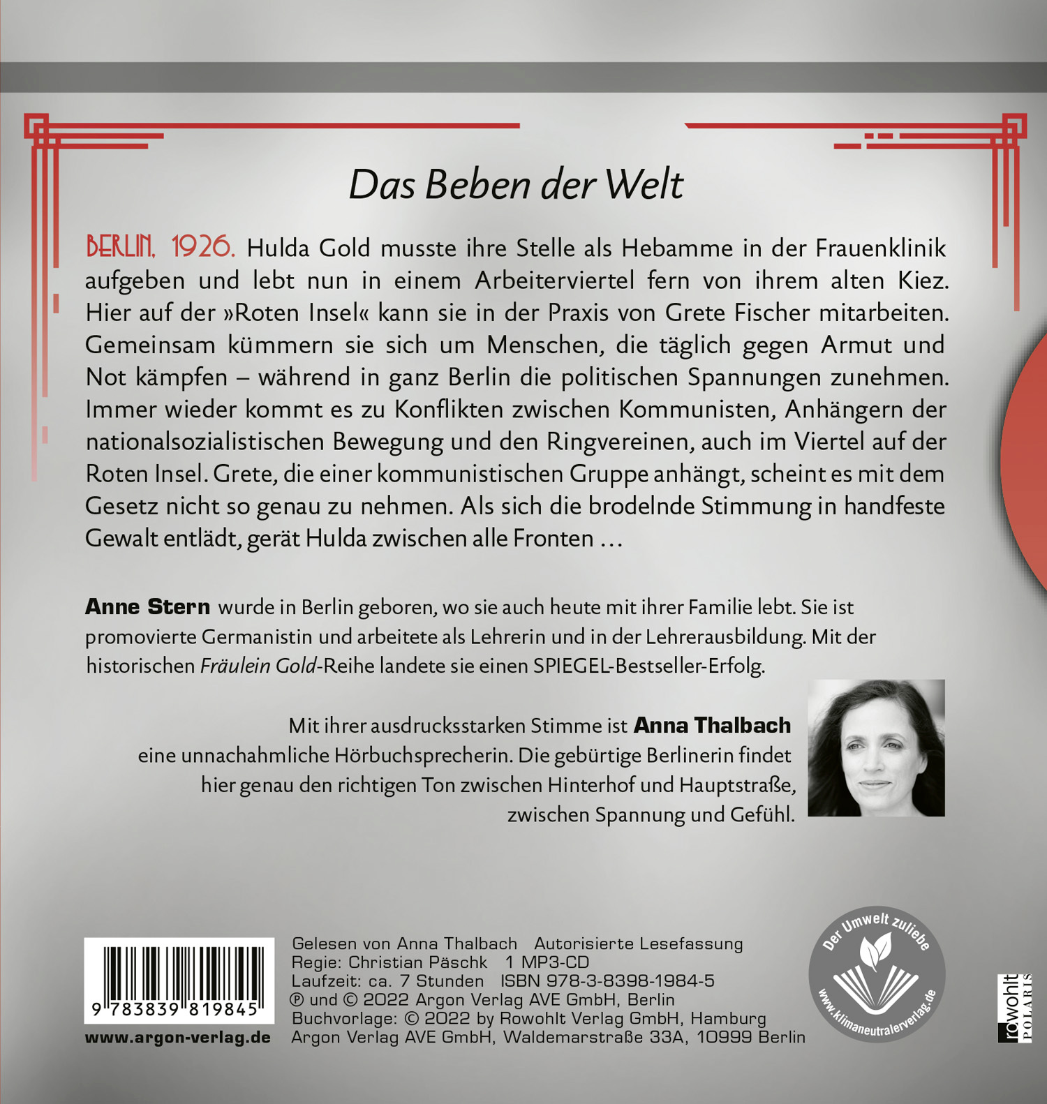 Berlin, 1926. Hulda Gold ist in einer schwierigen Lage: ledig, schwanger und ohne Auskommen. Zum Glück bietet ihr die junge Ärztin Grete Fischer an, als Helferin in ihrer kleinen Praxis auf der Roten Insel einzuspringen. Dort behandeln sie vornehmlich Arbeiterfrauen und sehen in die Abgründe von Armut und Not. Bald bemerkt Hulda, dass es die Kollegin dabei mit dem Gesetz nicht so genau nimmt. Und dass Grete Kontakte zu einer kommunistischen Gruppe mit radikalen Ansichten pflegt. Als ein Mord an einem Nachbarn verübt wird, taucht plötzlich der ehemalige Kommissar Karl North an Huldas Seite auf. Er verfolgt in dem Fall ganz eigene Interessen. Hulda gerät zwischen alle Fronten - und muss sich der größten Bewährungsprobe ihres Lebens stellen.