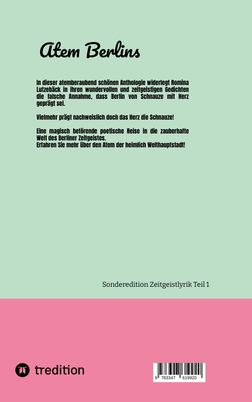 Romina Lutzebäck ist eine muntere und erfolgreiche junge spirituelle Poetin und Performerin, die nach aufregenden Wanderjahren in Berlin zur Zeit - verschnaufend bei den Möwen in Kiel an der Ostsee- lacht, schreibt und liebt. Zeitgeist-Lyrik, Romane, Kurzprosa und Ideen für Drehbücher sind der psychotherapeutischen Heilpraktikerin und Pädagogin ein besonderes Herzensanliegen... Seize the day!
