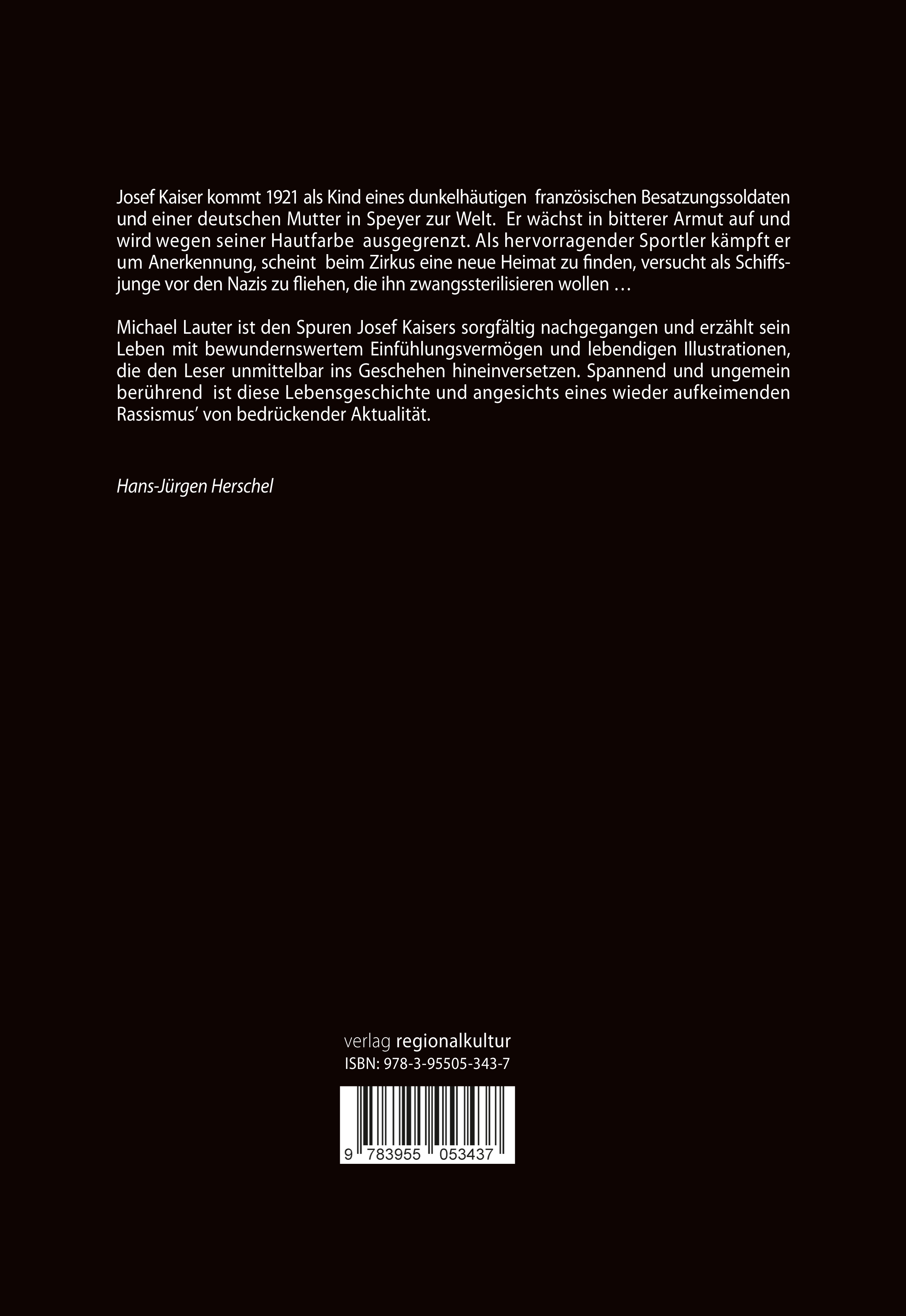 Josef Kaiser kommt 1921 als Kind eines dunkelhäutigen französischen Besatzungssoldaten und einer deutschen Mutter in Speyer zur Welt. Er wächst in bitterer Armut auf und wird wegen seiner Hautfarbe ausgegrenzt. Als hervorragender Sportler kämpft er um Anerkennung, scheint beim Zirkus eine neue Heimat zu finden, versucht als Schiffsjunge vor den Nazis zu fliehen, die ihn zwangssterilisieren wollen ...Michael Lauter ist den Spuren Josef Kaisers sorgfältig nachgegangen und erzählt sein Leben mit bewundernswertem Einfühlungsvermögen und lebendigen Illustrationen, die den Leser unmittelbar ins Geschehen hineinversetzen. Spannend und ungemein berührend ist diese Lebensgeschichte und angesichts eines wieder aufkeimenden Rassismus' von bedrückender Aktualität.