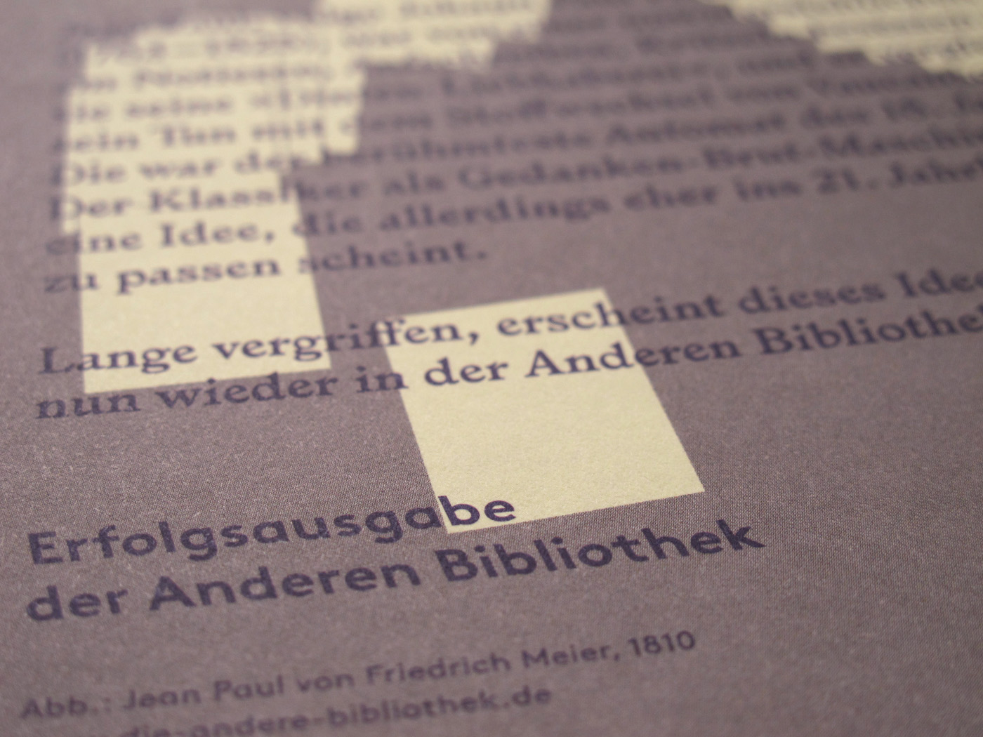 Jean Paul, vulgo Johann Paul Friedrich Richter (1763-1825), war von einer unwiderstehlichen Lust am Notieren, Aufschreiben, Kritzeln besessen. Er nennt sie seine "Dinten-Liebhaberei", und er vergleicht sein Tun mit dem Stoffwechsel von Vaucansons Ente. Die war der berühmteste Automat des achtzehnten Jahrhunderts. Der Klassiker als Gedanken-Brut-Maschine: das ist eine Idee, die allerdings eher ins einunzwanzigste zu passen scheint.