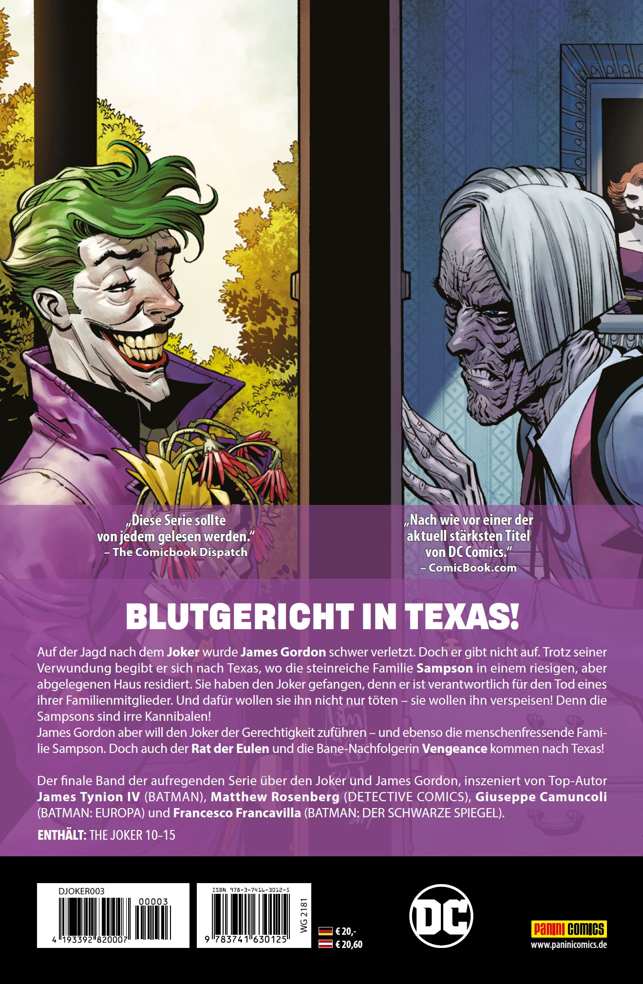 BLUTGERICHT IN TEXAS!Auf der Jagd nach dem Joker wurde James Gordon schwer verletzt. Doch er gibt nicht auf. Trotz seiner Verwundung begibt er sich nach Texas, wo die steinreiche Familie Sampson in einem riesigen, aber abgelegenen Haus residiert. Sie haben den Joker gefangen, denn er ist verantwortlich für den Tod eines ihrer Familienmitglieder. Und dafür wollen sie ihn nicht nur töten - sie wollen ihn verspeisen! Denn die Sampsons sind irre Kannibalen! James Gordon aber will den Joker der Gerechtigkeit zuführen - und ebenso die menschenfressende Familie Sampson. Doch auch der Rat der Eulen und die Bane-Nachfolgerin Vengeance kommen nach Texas! Der finale Band der aufregenden Serie über den Joker und James Gordon, inszeniert von Top-Autor James Tynion IV (BATMAN), Matthew Rosenberg (DETECTIVE COMICS), Giuseppe Camuncoli (BATMAN: EUROPA) und Francesco Francavilla (BATMAN: DER SCHWARZE SPIEGEL).ENTHÄLT: THE JOKER 10-15
