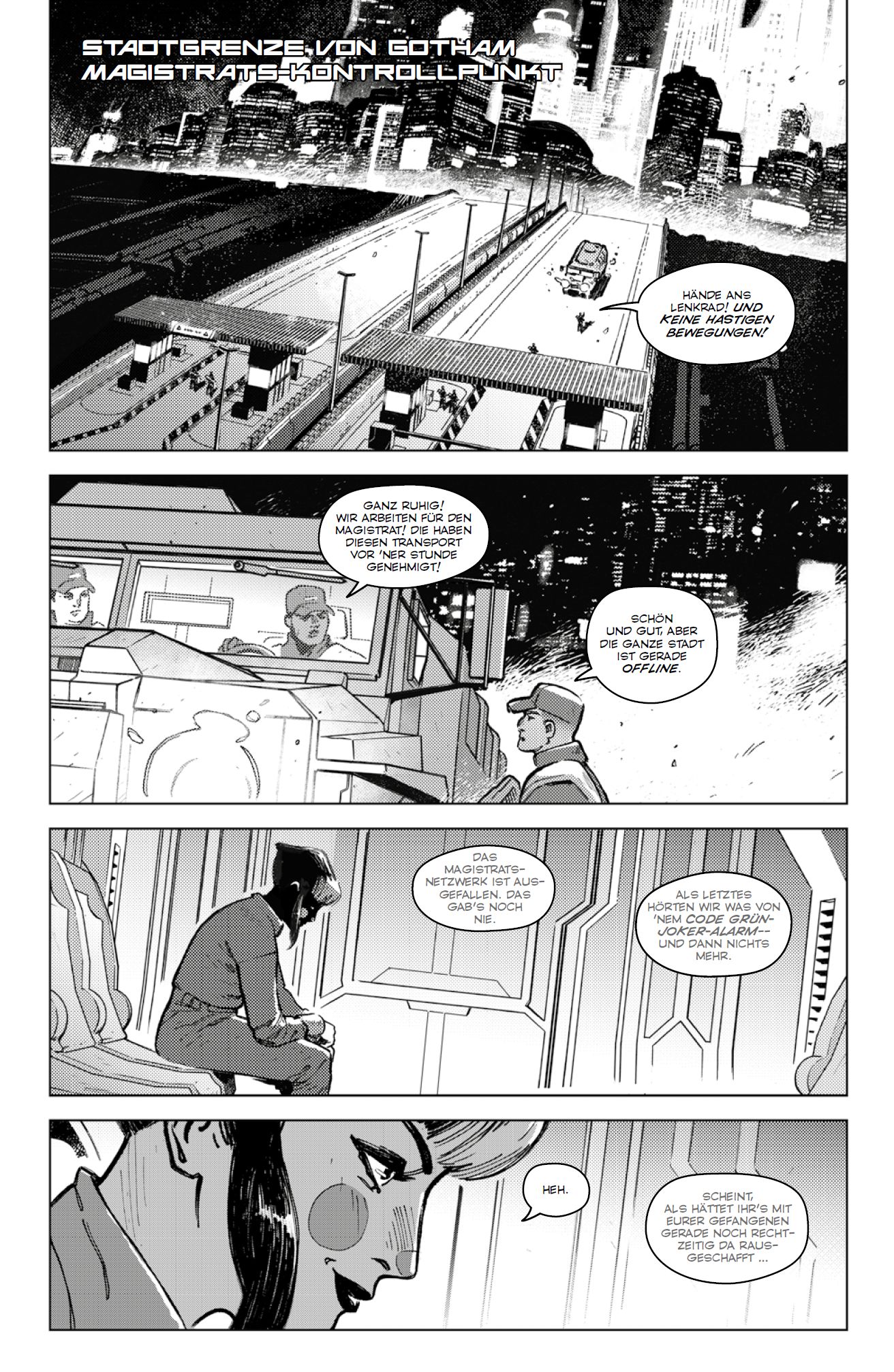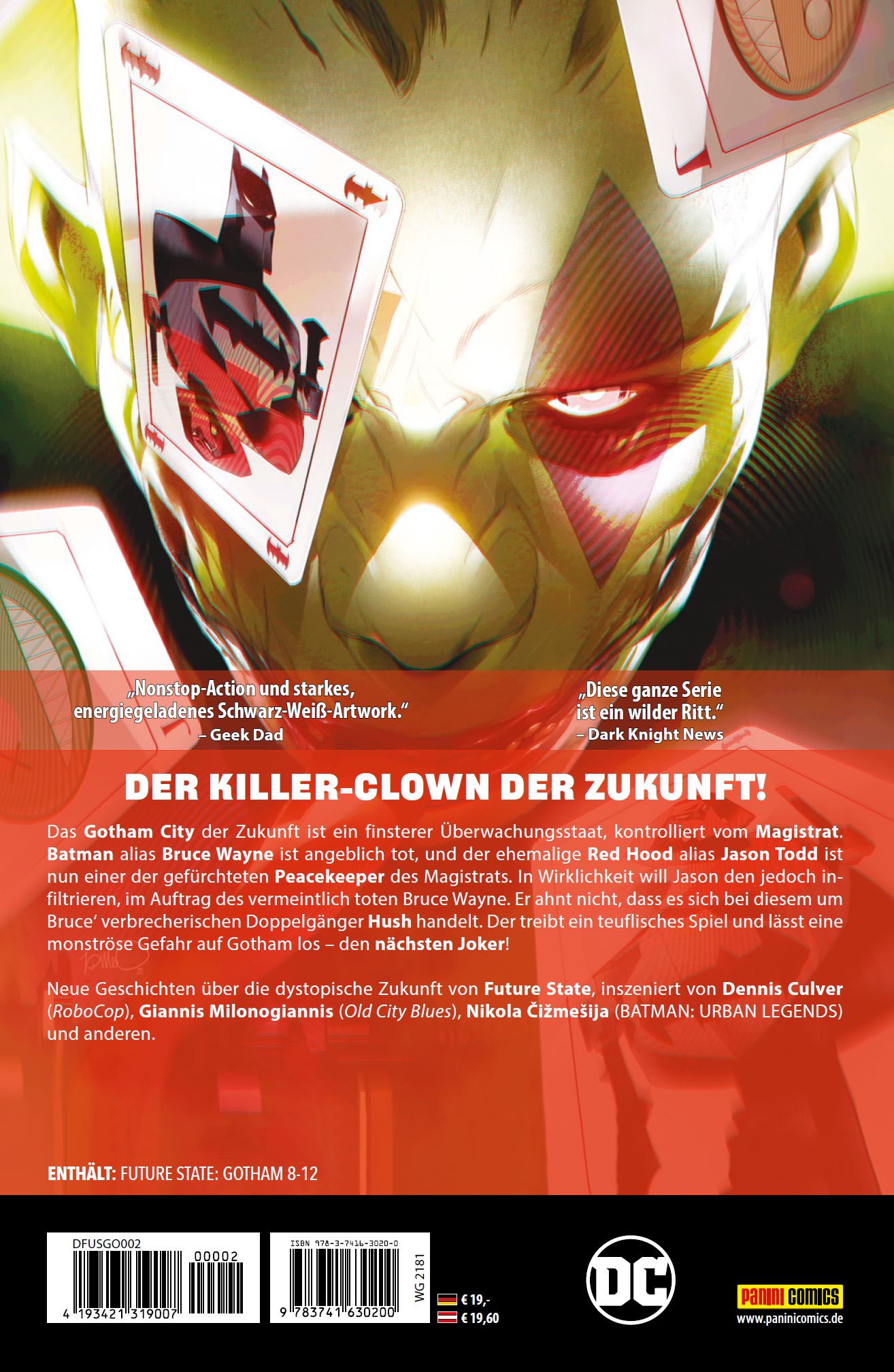 DER KILLER-CLOWN DER ZUKUNFT!Das Gotham City der Zukunft ist ein finsterer Überwachungsstaat, kontrolliert vom Magistrat. Batman alias Bruce Wayne ist angeblich tot, und der ehemalige Red Hood alias Jason Todd ist nun einer der gefürchteten Peacekeeper des Magistrats. In Wirklichkeit will Jason den jedoch infiltrieren, im Auftrag des vermeintlich toten Bruce Wayne. Er ahnt nicht, dass es sich bei diesem um Bruces verbrecherischen Doppelgänger Hush handelt. Der treibt ein teuflisches Spiel und lässt eine monströse Gefahr auf Gotham los - den nächsten Joker!Neue Geschichten über die dystopische Zukunft von Future State, inszeniert von Dennis Culver (RoboCop), Giannis Milonogiannis (Old City Blues), Nikola Cizmesija (BATMAN: URBAN LEGENDS) und anderen.ENTHÄLT: FUTURE STATE: GOTHAM 8-12